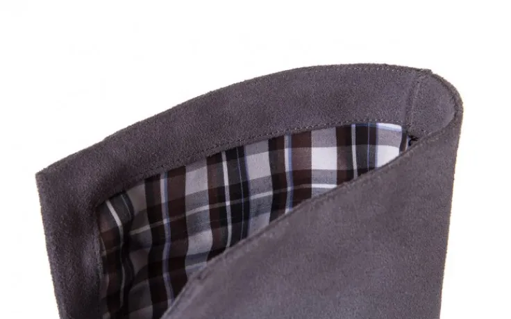 Szare kozaki – muszkieterki marki BAYLA. Cholewka butów wykonana jest z naturalnej skóry zamszowej wysokiej jakości. Mimo stosunkowo wysokiego obsaca typu słupek (10 cm) buty są bardzo stabilne. Dzięki antypoślizowej podeszwie kozaki nie ślizgają się na nawierzchni. Zamek błyskawiczny z boku butów znacznie ułatwia ich zakładanie. Dodatkowym atutem muszkieterek jest wywijana cholewka w modny wzór klasycznej, ponadczasowej kraty. Buty posiadają ocieplaną wkładkę, która podwyższa komfort termiczny.