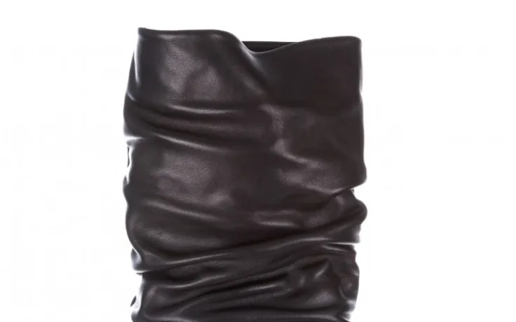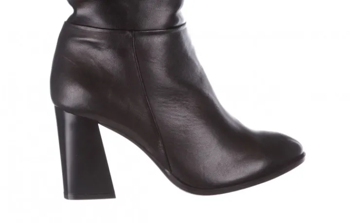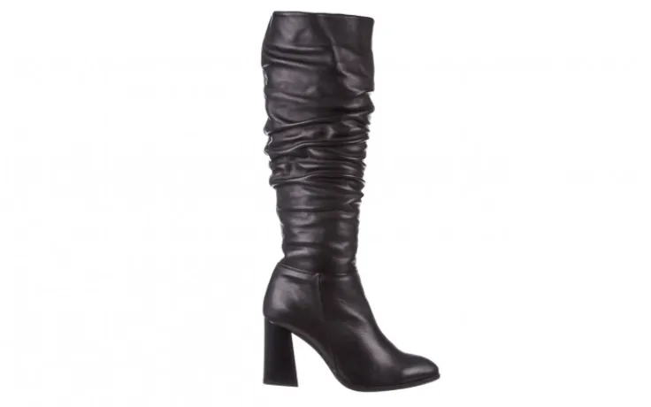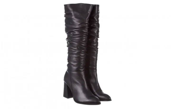 Wyściółka i wkładka wykonana z materiału miękkiego, ocieplanego w kolorze czarnym. Buty na wygodnym 9-centymetrowym obcasie typu słupek. Kozaki o długości cholewki do kolana. Obuwie zasuwane na zamek (nie jest on na całej długości). Klasyczna długość cholewki połączona z ciekawym motywem marszczenia.