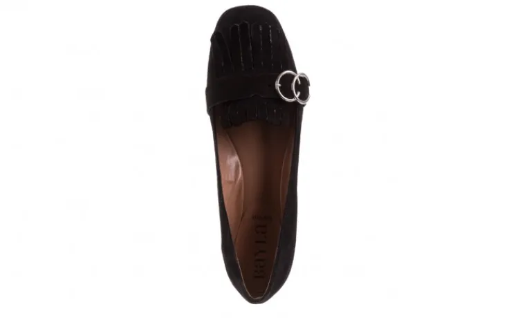 Czarne zamszowe lordsy marki BAYLA wykonane są z wysokogatunkowego zamszu. Posiadają skórzaną wkładkę i antypoślizgową podeszwę gwarantującą komfort użytkowania.