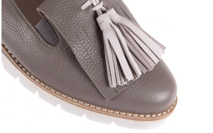 Noski butów ozdobione frędzlami w kolorze beżowym oraz awangardowo naciętą skórzaną podkładką.