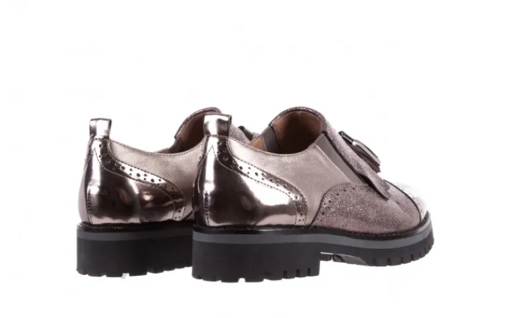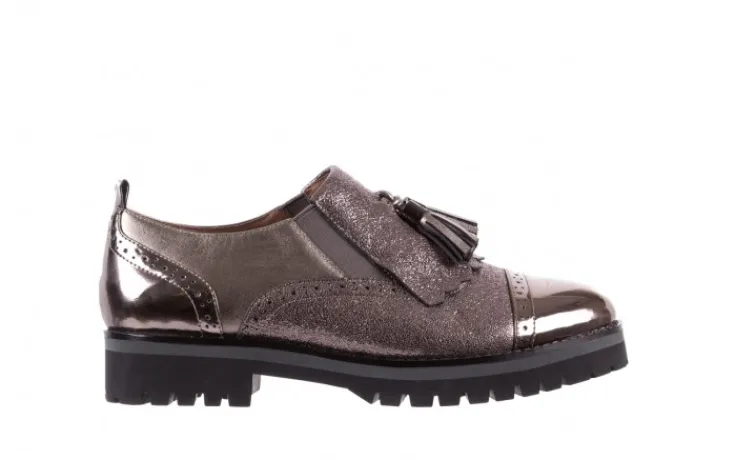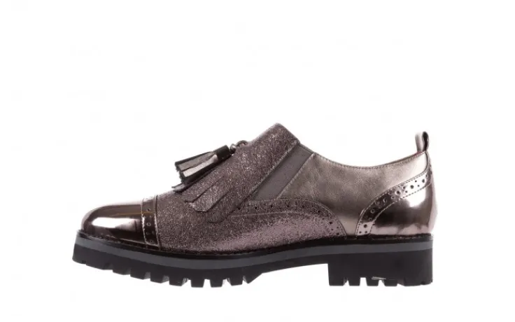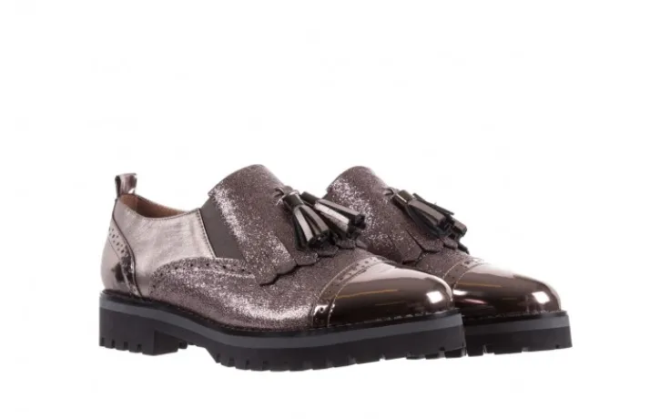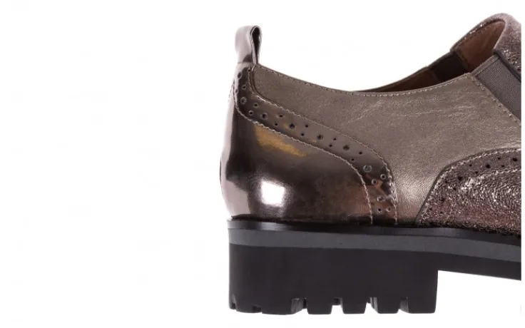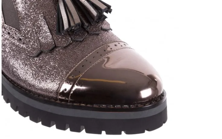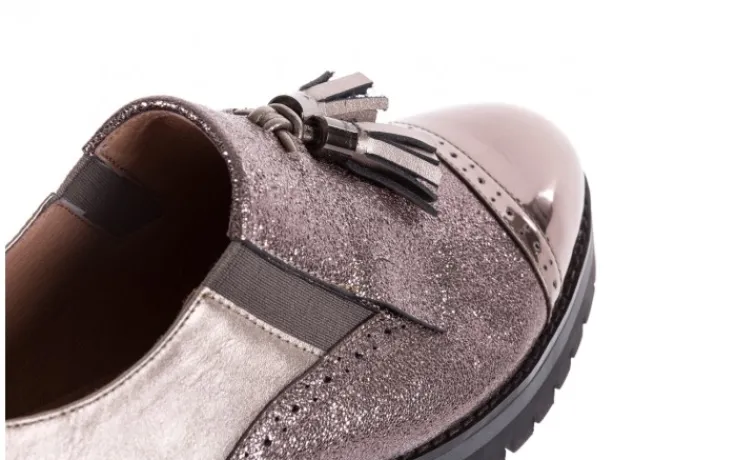 Półbuty marki Bayla. Wykonane z naturalnej skóry licowej w srebrnym kolorze. Na nosku oraz zapiętku skóra lakierowana z ozdobnymi przeszyciami w metalicznym połysku. Pozostała część cholewki ze skóry w matowym odcieniu oraz z unikatowym efektem „popękanej” skóry. Dodatkowo na przodzie ozdobne frędzelki. Na zapiętku logo marki w srebrnym kolorze. Niezwykle efektowne i nowoczesne. Gumki umiejscowione po bokach języka ułatwiają ich zakładanie a miękka wkładka oraz wyściółka ze skóry naturalnej podwyższają komfort użytkowania.