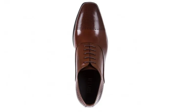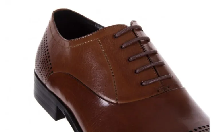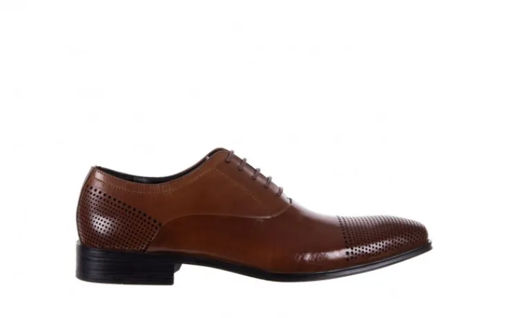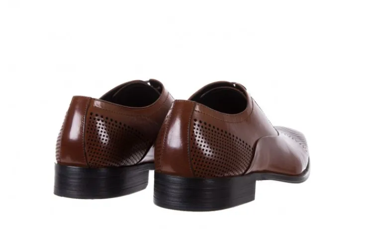 Brązowe półbuty marki Bayla wykonane są z połyskującej, częściowo perforowanej skóry licowej. Cholewki skrojone w stylu OXFORD. Sznurowane z przodu. Posiadają skórzana wkładkę i wyściółkę oraz antypoślizgową podeszwę.