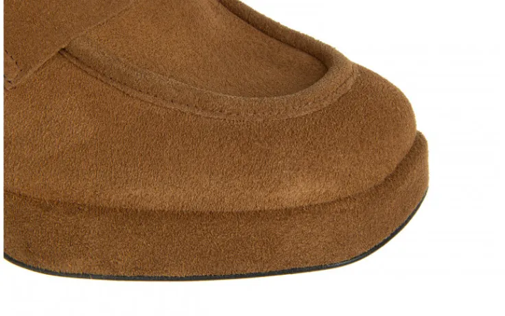 Półbuty wsuwane na słupku oraz platformie. Słupek zapewnia stabilność i wygodę, a platforma daje dodatkową wysokość, co jest szczególnie korzystne dla osób, które chcą optycznie wydłużyć nogi. Wkładka oraz wyściółka ze skóry naturalnej zapobiega poceniu się stóp oraz zapewnia odpowiednią cyrkulację powietrza we wnętrzu buta. Są to buty, które mogą być noszone zarówno na co dzień, jak i na bardziej formalne okazje.