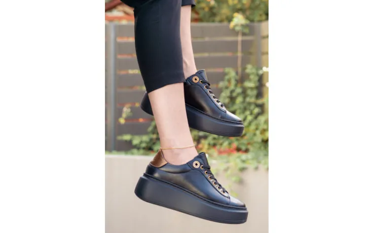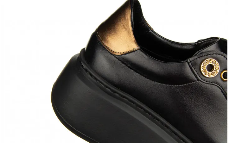 Półbuty sznurowane z klasyczną cholewką przed kostkę. Wkładka oraz wyściółka ze skóry naturalnej zapewnia odpowiednią cyrkulację powietrza we wnętrzu buta oraz zapobiega poceniu się stóp. Model na wygodnej, wyższej podeszwie. Zapiętek i okucia w kolorze złotym.