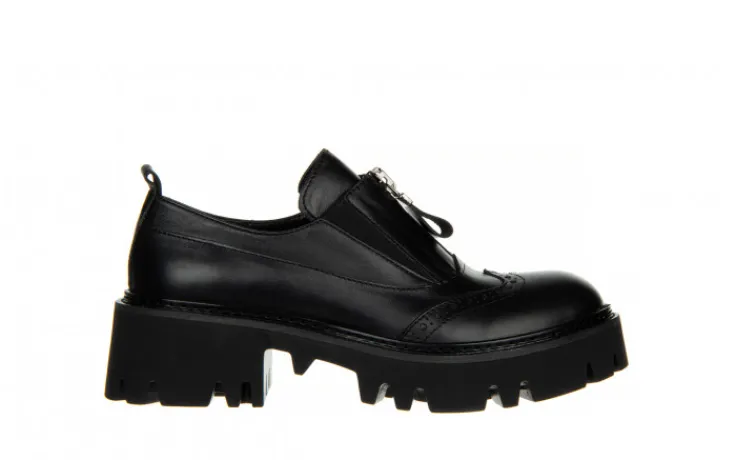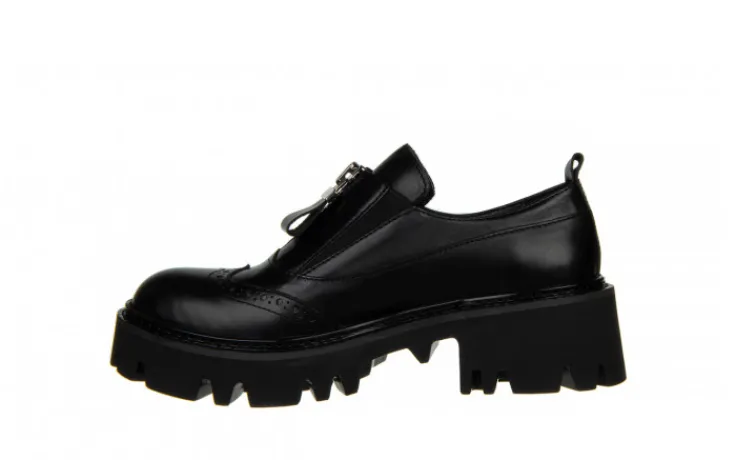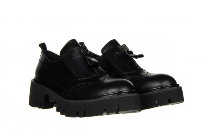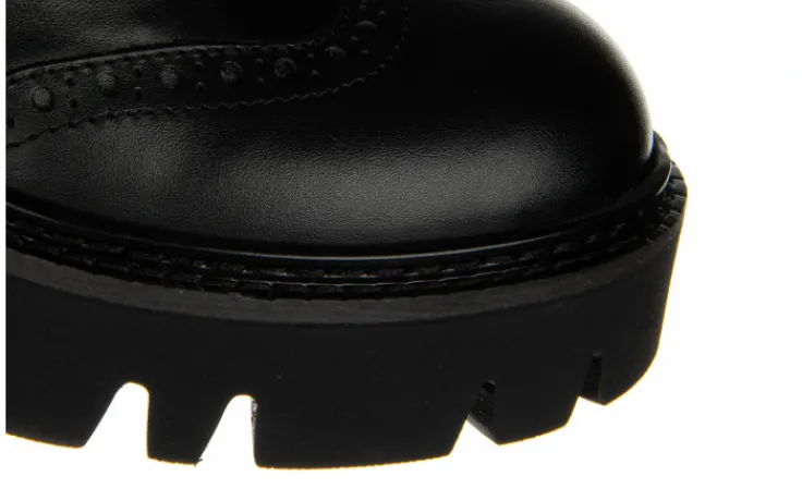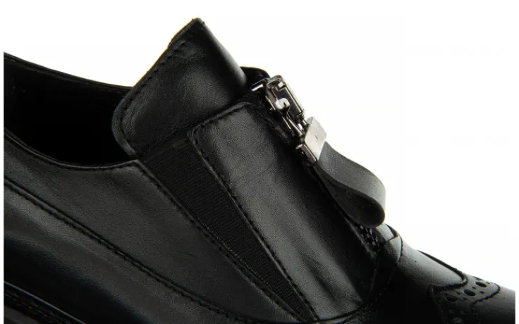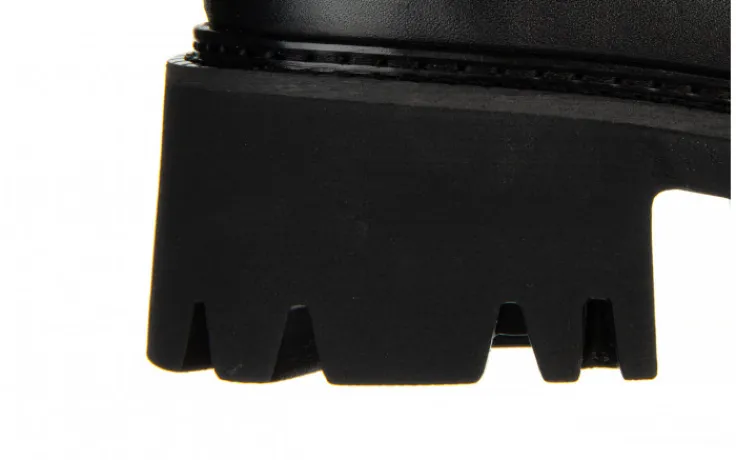 Cholewka o prostym kształcie kończąca się przed kostką. Model bardzo ładnie prezentuje się na nodze. Posiada ażurowany wzór z przodu cholewki, efektowny zasuwak oraz gumki ułatwiające zakładanie. Wkładka oraz wyściółka zrobione są ze skóry naturalnej zapobiegającej poceniu się stóp oraz zapewniającej odpowiednią cyrkulację powietrza we wnętrzu buta. Platforma dodaje centymetrów i przy tym sprawia, że buty stają się bardzo wygodne. Antypoślizgowa, gumowa podeszwa z głębszym bieżnikiem amortyzuje wstrząsy oraz izoluje stopę od zimnego podłoża.