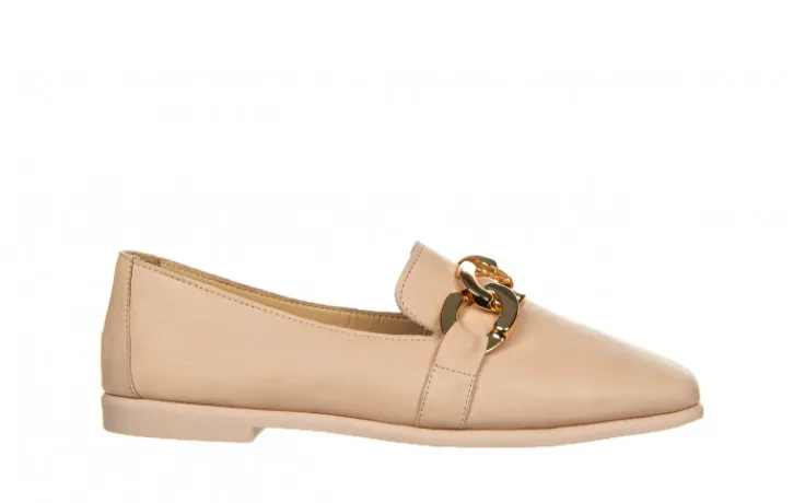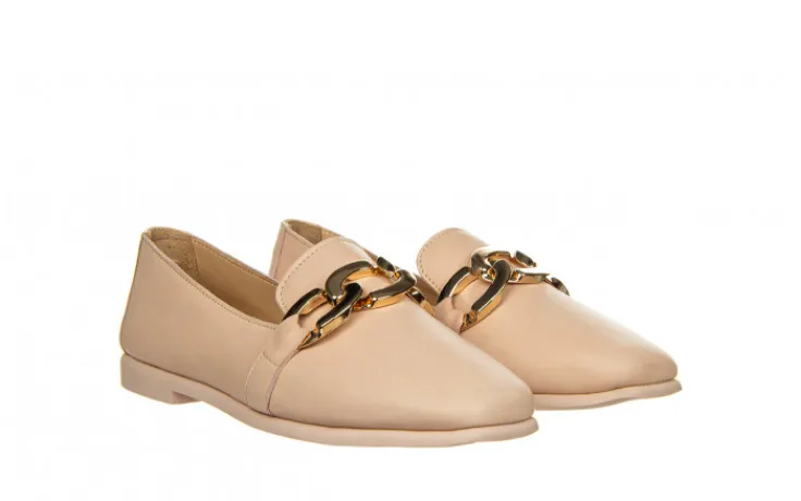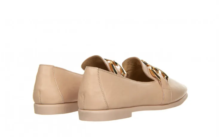 Lekkie półbuty wykonane ze skóry naturalnej licowej. Wnętrze skórzane zapewnia odpowiednią cyrkulację powietrza. Miękkość i odpowiednie wyprofilowanie wkładek zwiększa amortyzację. Antypoślizgowa podeszwa z gumy zapewnia trwałość i przyczepność. Z przodu złota ozdoba.
