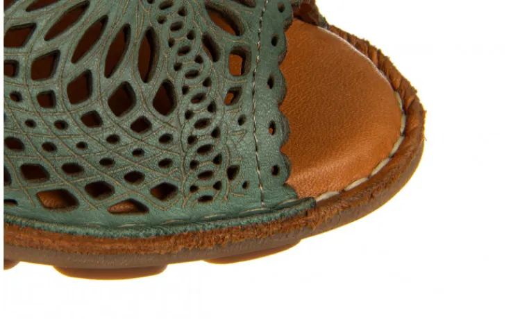 Oddychająca ażurowa cholewka z perforacją zapewnia odpowiednie odprowadzanie wilgoci z wnętrza buta. Skórzane wkładki gwarantują miękkość podczas chodzenia. Wyściółka skórzana, ponadto zapiętek wykonany z miłego w dotyku zamszu, który niweluje możliwość otarć pięty. Antypoślizgowa podeszwa zgina się na linii śródstopia, dzięki czemu pozwala stopie pracować. Oczuwalna miękkość to zasługa miękkich skór użytych w produkcji tego modelu.