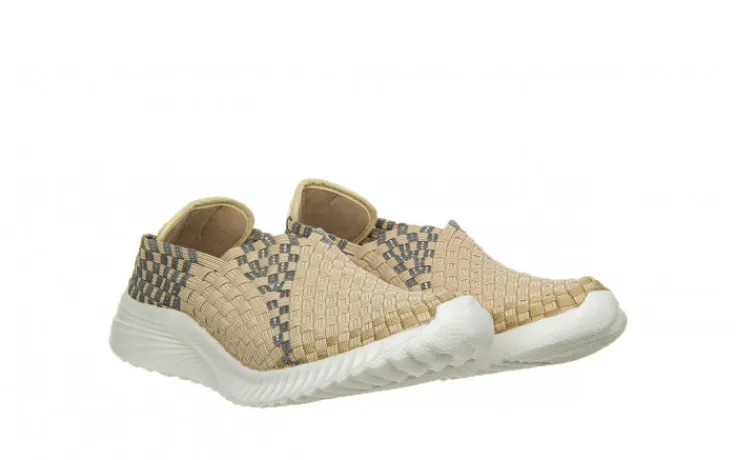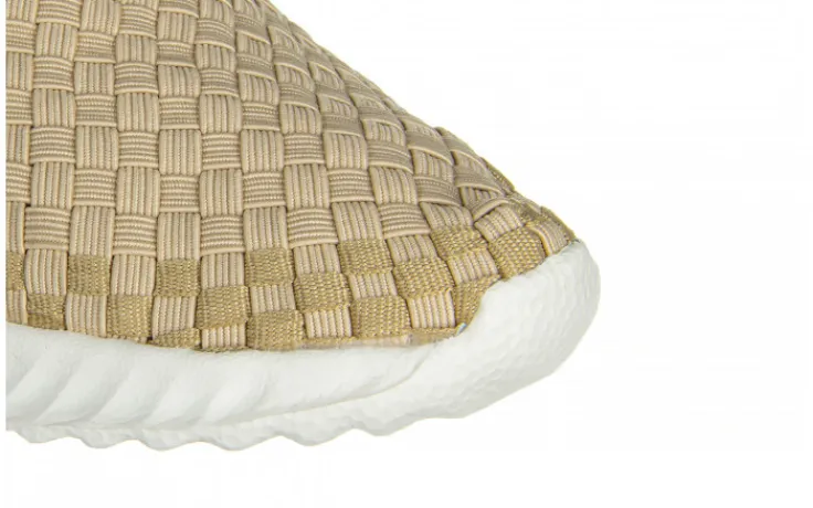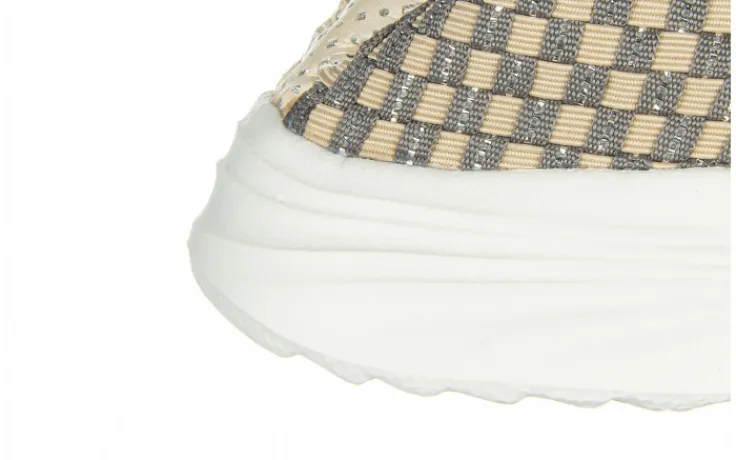 Plecione cholewki z wyjątkowo elastycznych gumek idealnie dopasowują się do indywidualnego kształtu stopy. Bardzo miękkie, piankowe wkładki oraz lekkie, antypoślizgowe podeszwy sprawiają, że buty są bardzo wygodne. Zapiętek wykonany z miłego w dotyku zamszu niweluje możliwość otarć pięty. Na zapiętku kwadraty i kropki wypełnione połyskującym srebrnym brokatem. Model jest lekki, co bardzo dobrze wpływa na komfort użytkowania. Dodatkowym atutem buta jest możliwość prania w temperaturze 40 stopni.