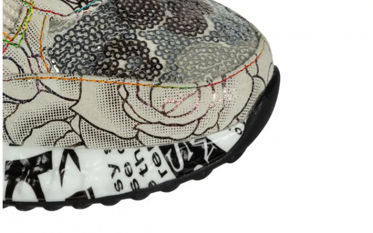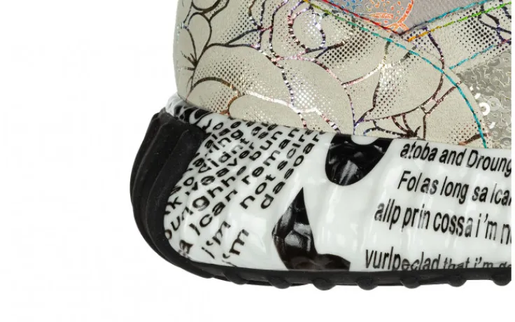 Oryginalne półbuty damskie sznurowane na płaskim w unikalny, kreatywny wzór. Wnętrze z naturalnej skóry. Cholewka z połącznia skóry naturalnej z materiałem. Miękka, skórzana wkładka. Podeszwa z wysokogatunkowego, antypoślizgowego piankowego tworzywa oraz gumy. Obuwie bardzo lekkie.