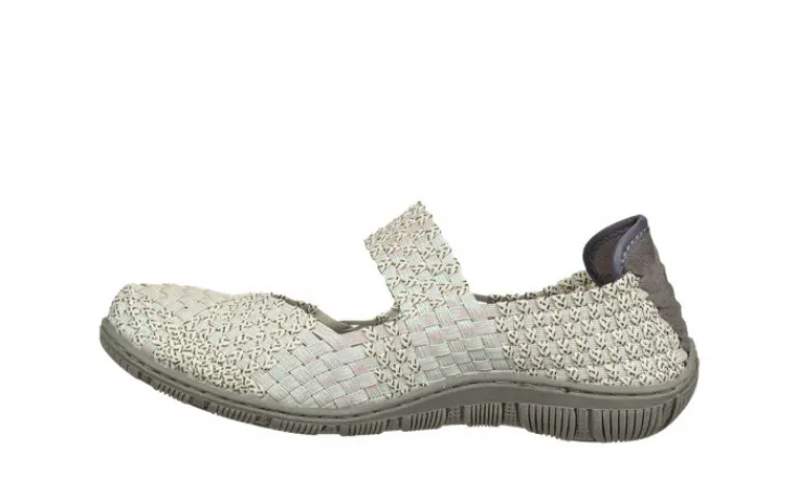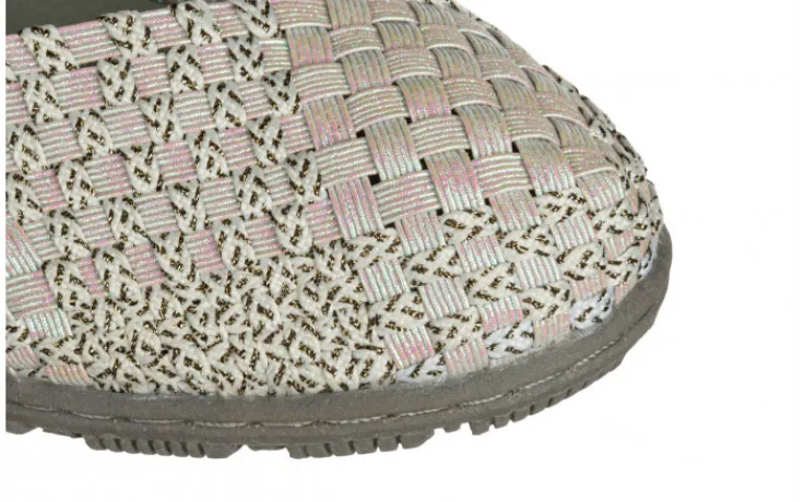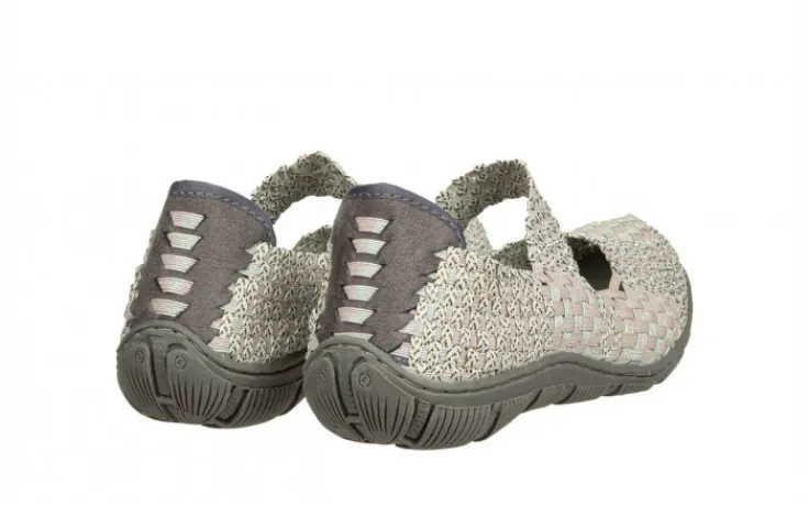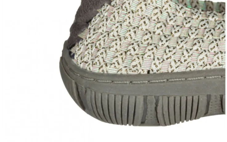 Plecione cholewki zostały zrobione z wyjątkowo elastycznych gumek, dzięki czemu idealnie dopasowują się do indywidualnego kształtu (tęgości) stopy. Bardzo miękkie, piankowe wkładki oraz lekkie, antypoślizgowe podeszwy sprawiają, że buty są bardzo wygodne. Ponadto zapiętek wykonany z miłego w dotyku zamszu niweluje możliwość otarć pięty. Przez środek biegnie gruby pleciony pasek utrzymujący stopę w miejscu. Model jest lekki, co bardzo dobrze wpływa na komfort użytkowania. Dodatkowym atutem butów jest możliwość prania w temperaturze 40 stopni.