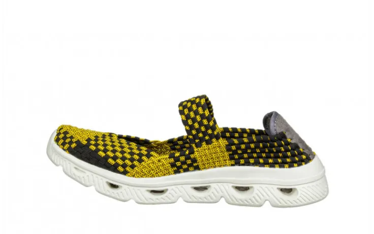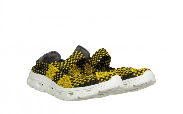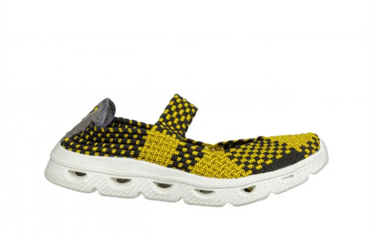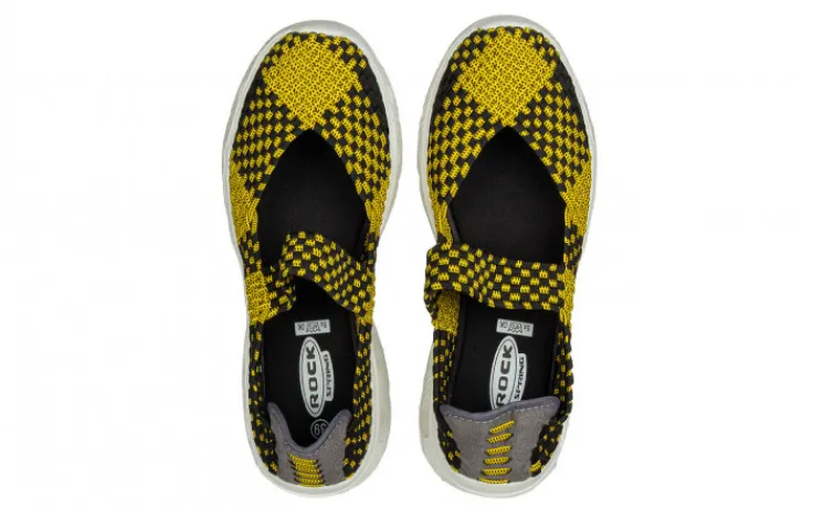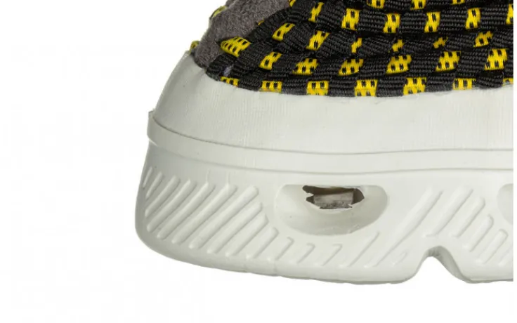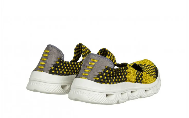 Plecione cholewki zostały zrobione z wyjątkowo elastycznych gumek, dzięki czemu idealnie dopasowują się do indywidualnego kształtu (tęgości) stopy. Bardzo miękkie, piankowe wkładki oraz lekkie, antypoślizgowe podeszwy sprawiają, że buty są bardzo wygodne. Ponadto zapiętek wykonany z miłego w dotyku zamszu niweluje możliwość otarć pięty. Przez środek biegnie gruby pleciony pasek utrzymujący stopę w miejscu. Model jest lekki, co bardzo dobrze wpływa na komfort użytkowania. Dodatkowym atutem butów jest możliwość prania w temperaturze 40 stopni.