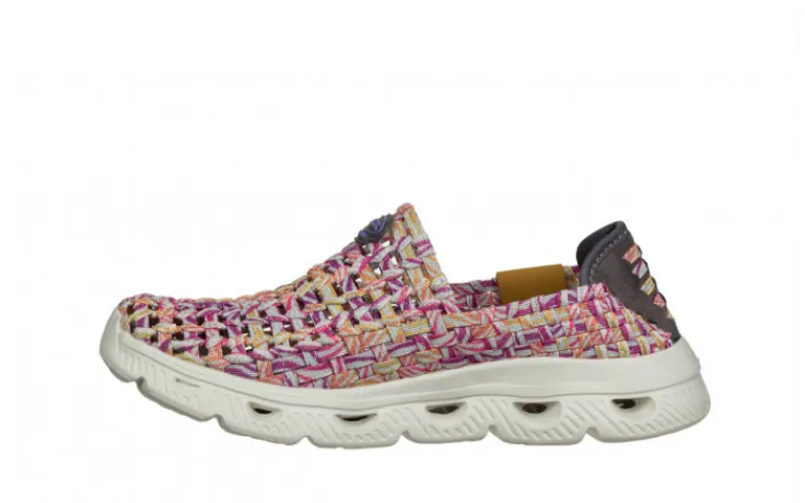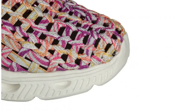 Plecione cholewki zostały zrobione z wyjątkowo elastycznych gumek, dzięki czemu idealnie dopasowują się do indywidualnego kształtu (tęgości) stopy. Na całej przedniej cholewce przewiewne otwory. Bardzo miękkie, piankowe wkładki oraz lekkie, antypoślizgowe podeszwy sprawiają, że buty są bardzo wygodne. Ponadto zapiętek wykonany z miłego w dotyku zamszu niweluje możliwość otarć pięty. Model jest lekki, co bardzo dobrze wpływa na komfort użytkowania. Dodatkowym atutem buta jest możliwość prania w temperaturze 40 stopni.