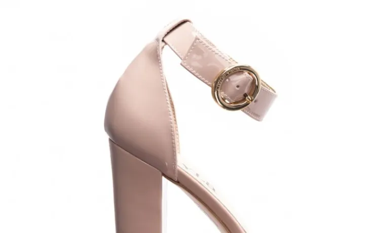 Model składa się z dwóch grubych pasów: jeden wokół palców, drugi wokół kostki. Zapinane na złotą klamrę. Z zakrytą piętą. Miękka, profilowana wkładka wykonana jest w całości ze skóry naturalnej, co znacznie podwyższa komfort użytkowania. Buty na na 10- cm słupku obitym skórą.