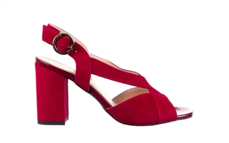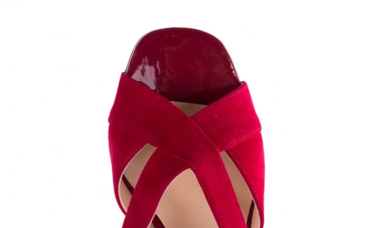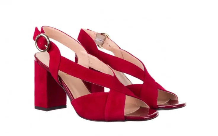 Model składa się z dwóch paseczków oplatających stopy krzyżując się w literę „X”. Zapinane na złotą klamrę. Z odkrytą piętą. Miękka, profilowana wkładka wykonana jest w całości ze skóry naturalnej, co znacznie podwyższa komfort użytkowania. Buty na na 8,5 cm słupku obitym skórą.