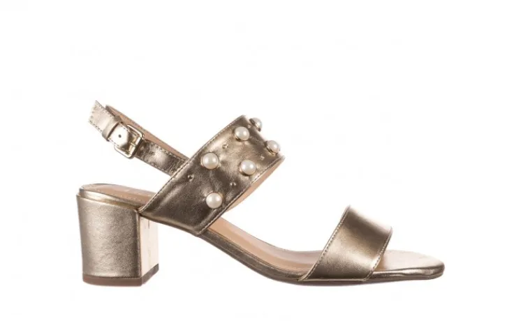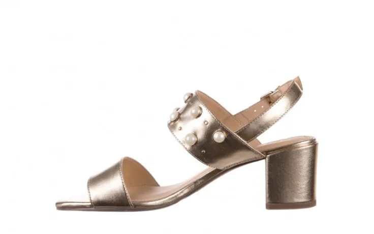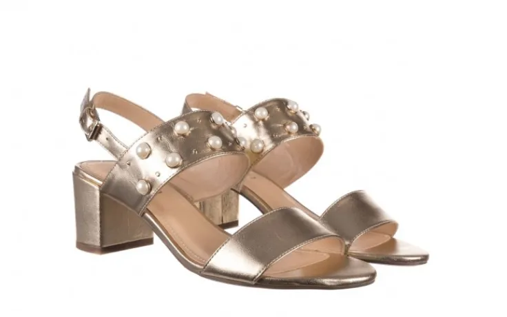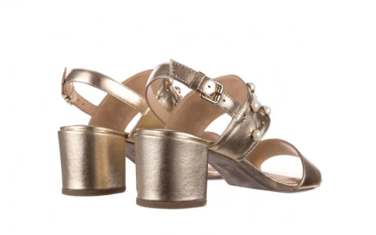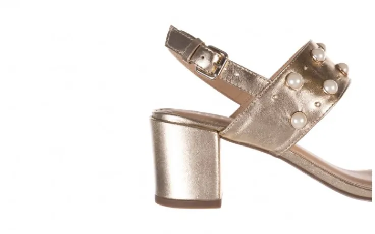 Model składa się z dwóch grubych pasów, jeden z nich ozodobiony perłami oraz dżetami. Zapinane na złotą klamerkę. Otwarta pięta. Miękka, profilowana wkładka wykonana jest w całości ze skóry naturalnej, co znacznie podwyższa komfort użytkowania. Dzięki grubemu, klockowemu obcasowi sandały są stabilne i wygodne.