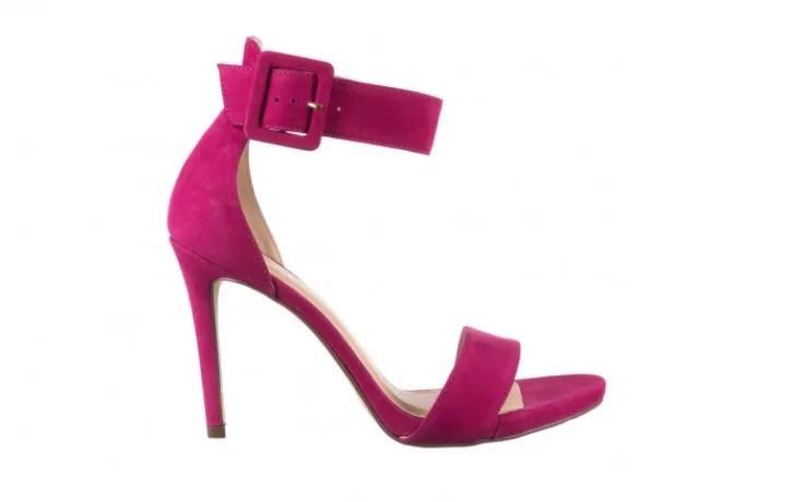 Model składa się z dwóch grubych pasów: jeden wokół palców, drugi wokół kostki. Zapinane na obita skóta klamrę. Z zakrytą piętą. Miękka, profilowana wkładka wykonana jest w całości ze skóry naturalnej, co znacznie podwyższa komfort użytkowania. Buty na na 10- cm szpilce obitej skórą.