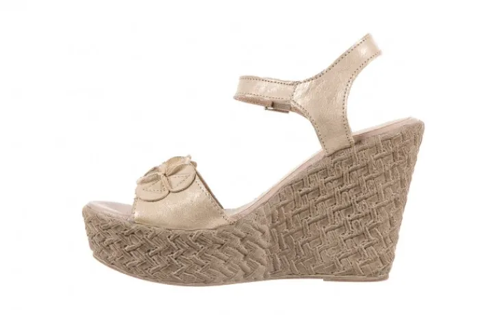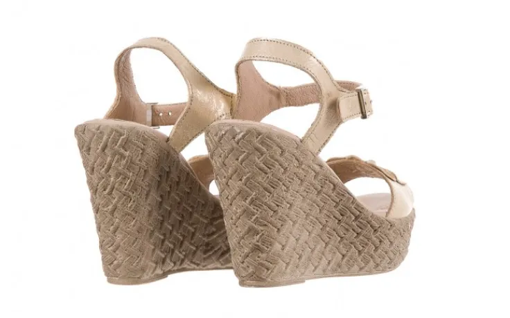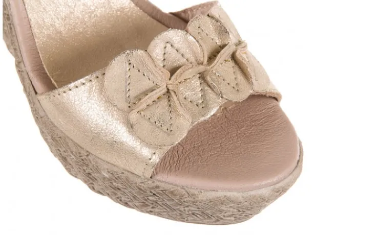Paski wykonane z miękkiej naturalnej skóry w kolorze jasnego złota. Z przodu ozdobione wstawkami skóry w tym samym kolorze. Zapinane wokół kostki.