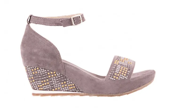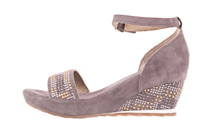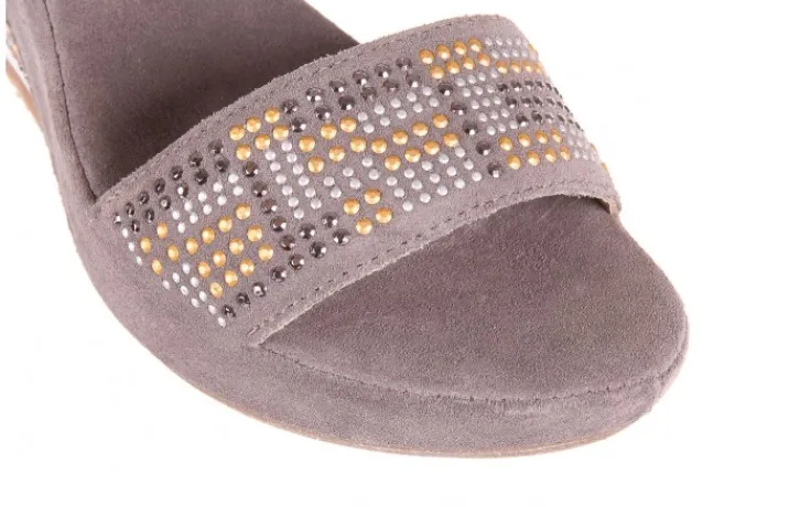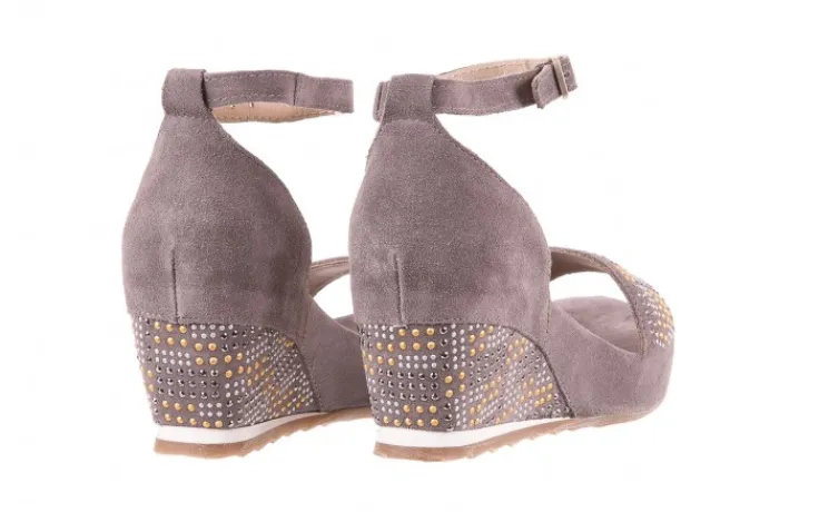 Wykonane z naturalnego zamszu w kolorze szarym. Przód butów oraz koturn ozdobiony błyszczącymi się dżetami w kolorach: srebrnym, złotym i czarnym. Miękka wkładka ze skóry zamszowej, oraz wyściółka wykonana ze skóry naturalnej licowej. Podeszwa wykonana z antypoślizgowej gumy w kolorze beżowym. Buty posiadają niski 7- centymetrowy wygodny koturn. Zapinane wokół kostki.