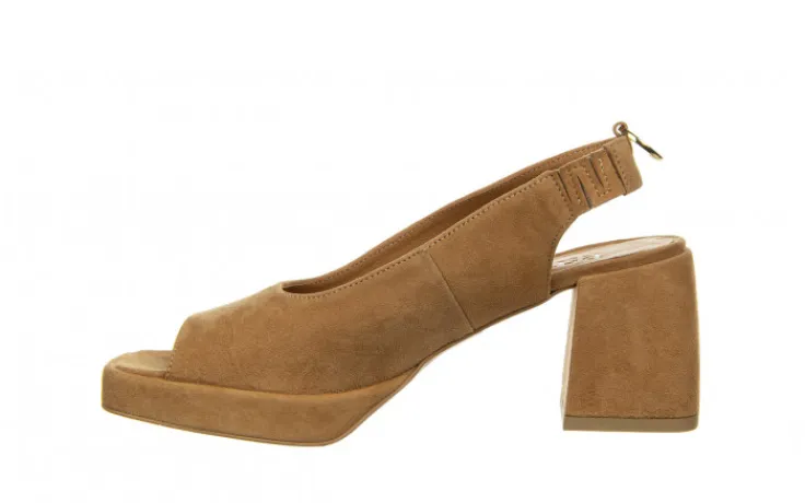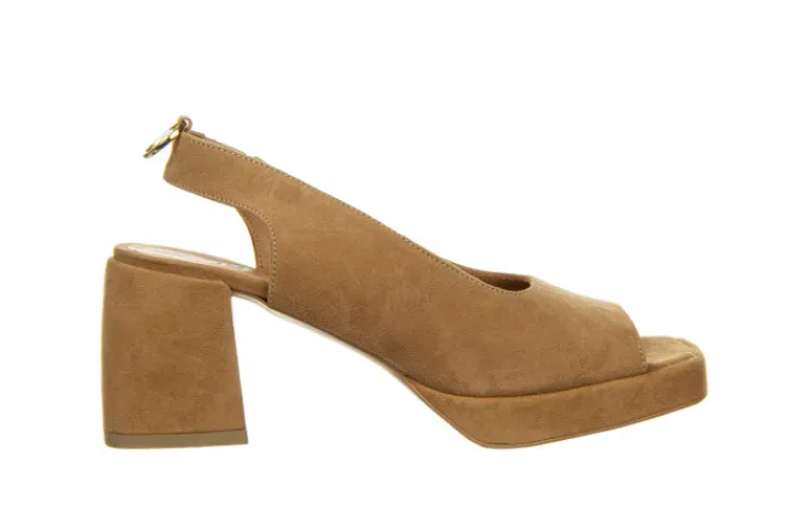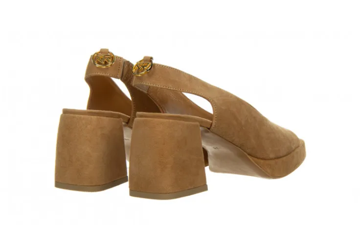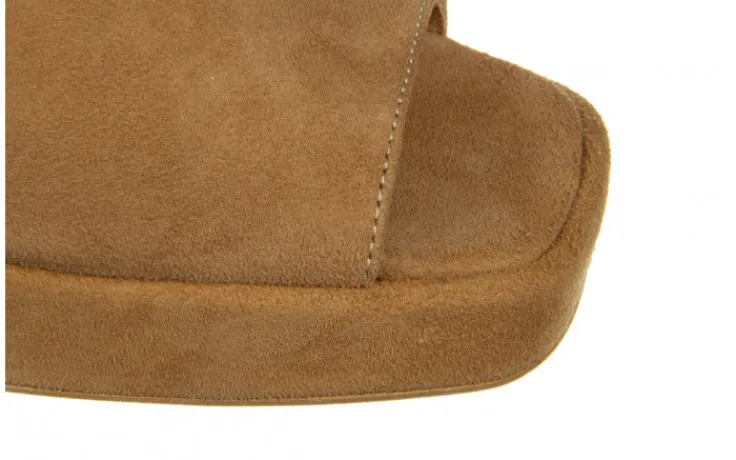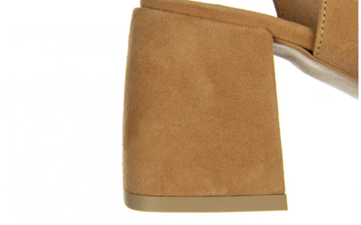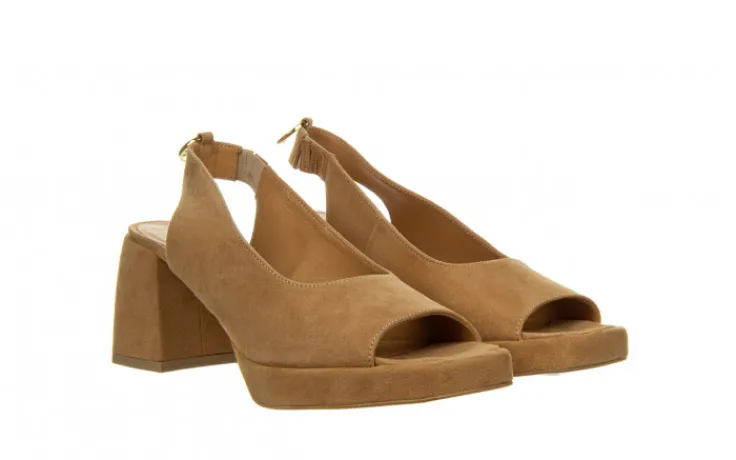 Sandały na stabilnym słupku z paskiem sięgającym za piętę z wszytą gumką. Opływowy kształt cholewki sprawia, że buty bardzo dobrze trzymają stopę. Platforma niweluje odczuwalną wysokość obcasa.