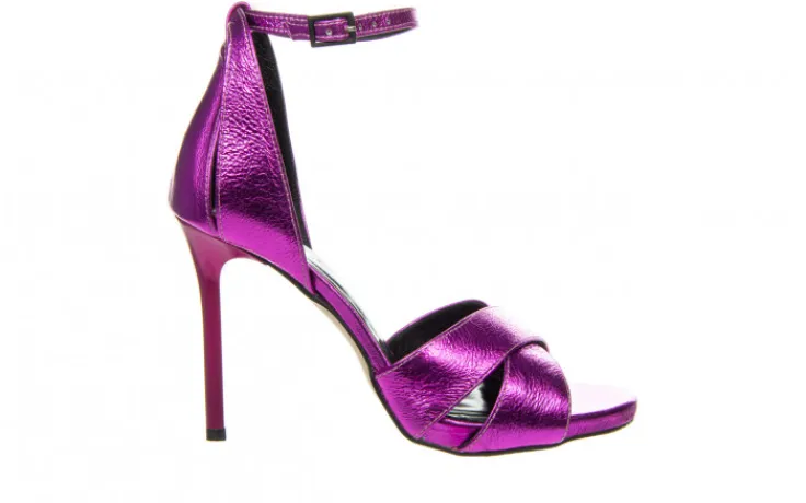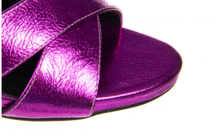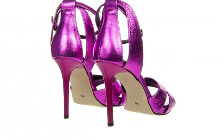 Sandały na szpilce z zakrytą piętą i odkrytymi palcami. Zapięcie na klamerkę na pasku okalającym kostkę pozwala dopasować buty do szerokości stopy. Niewielka platforma niweluje wysokość obcasa sprawiając, że buty są bardzo wygodne.