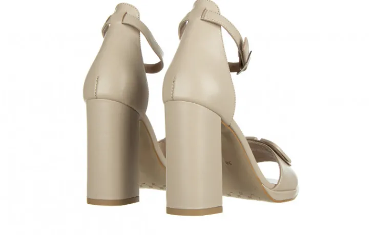 Sandały z zabudowaną piętą na 10,5 cm stabilnym słupku. Wkładka w kolorze beżowym z podbitą gąbką zapewniającą miękkość, wykonana jest w całości ze skóry naturalnej, co znacznie podwyższa komfort użytkowania. Stabilny obcas pozwala zachować równowagę nawet przy bardzo problematycznym podłożu. Wokół kostki biegnie pasek zapinany na złotą sprzączkę.