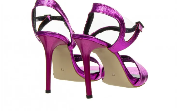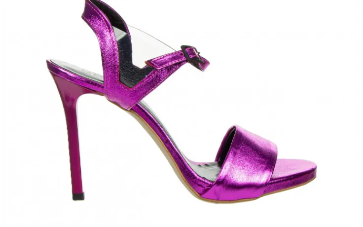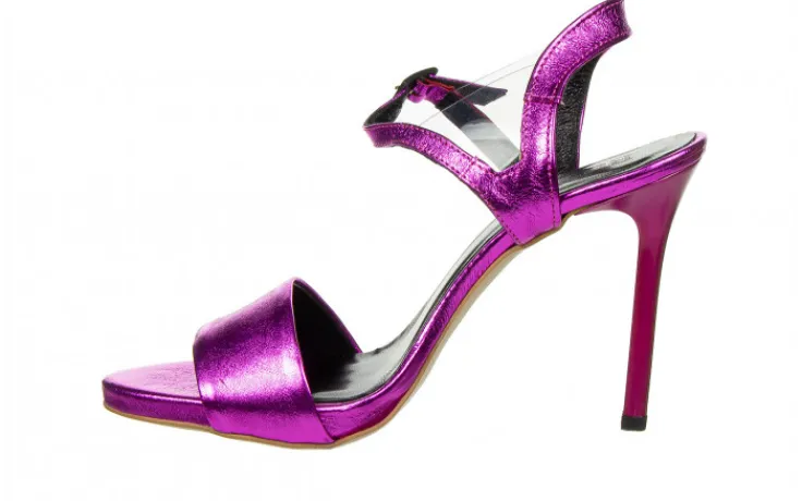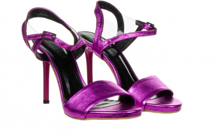 Odkryte sandały na szpilce. Pasek z zapięciem na czarną sprzączkę z możliwością dopasowania do szerokości stopy. Przy paskach intrygująca transparentna wstawka. Niewielka platforma niweluje odczuwalną wysokość obcasa. Odpowiednio wyprofilowana podeszwa zapewnia wsparcie dla stóp.