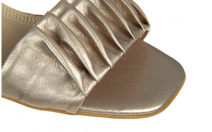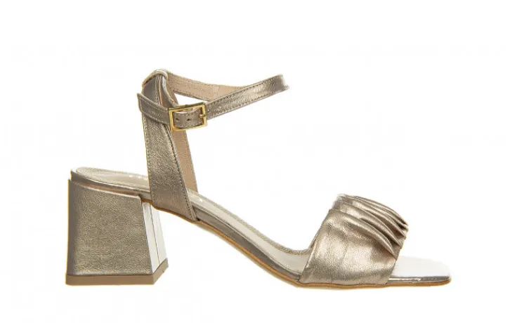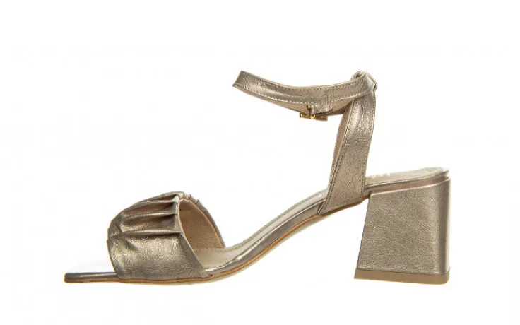 Odkryte sandały na stabilnym słupku. Na przednim pasku efektowne marszczenie. Pasek okalający kostkę zapinany na złotą sprzączkę.