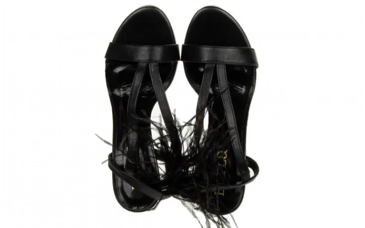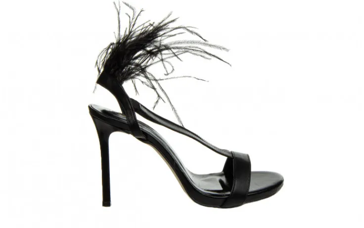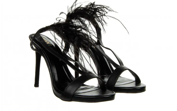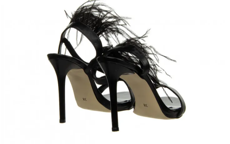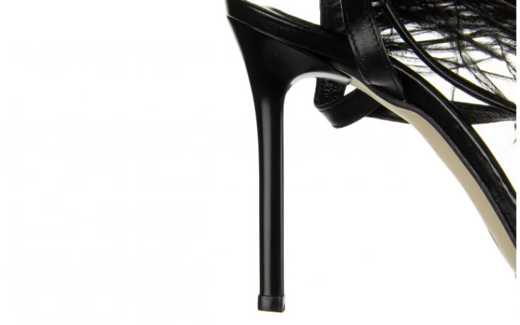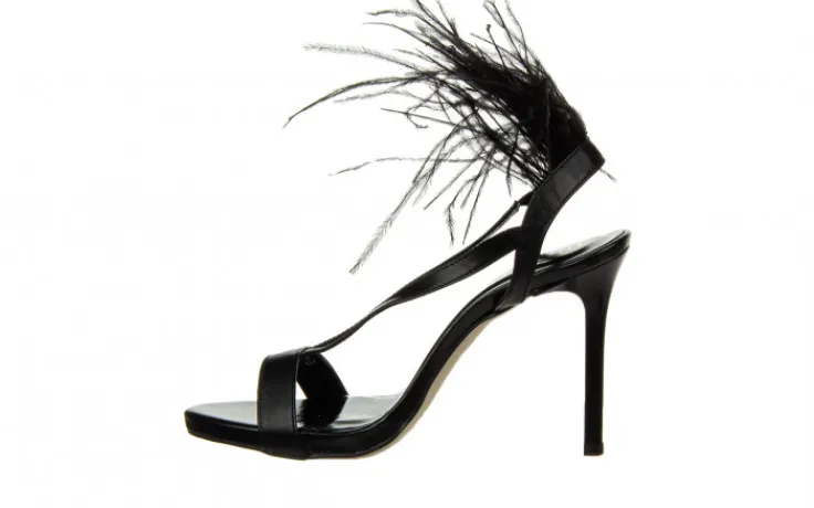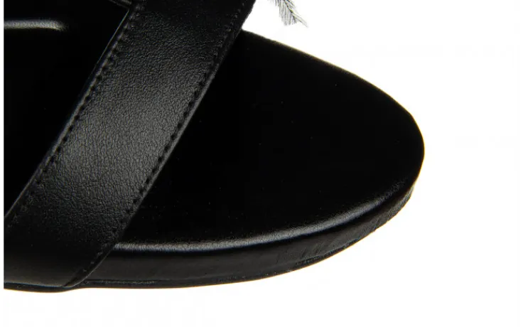 Eleganckie sandały damskie na szpilce pięknie prezentują się na nodze. Ozdobne pióra nadają im wyjątkowego, kobiecego charakteru i przyciągają wzrok. Pasek sięgający za piętę z wszytą gumką ułatwia zakładanie. Ułożenie pasków sprawia, że buty dobrze trzymają stopę. Niewielka platforma niweluje wysokość obcasa.