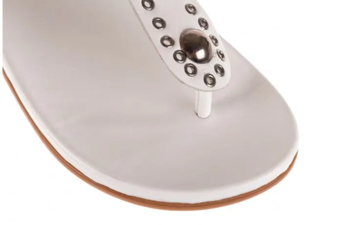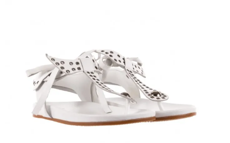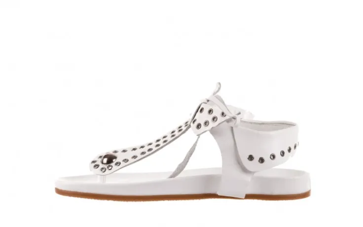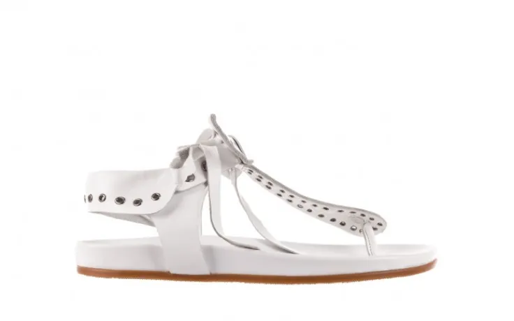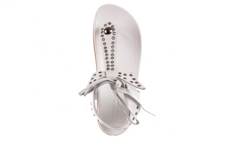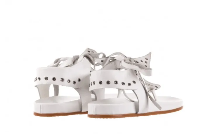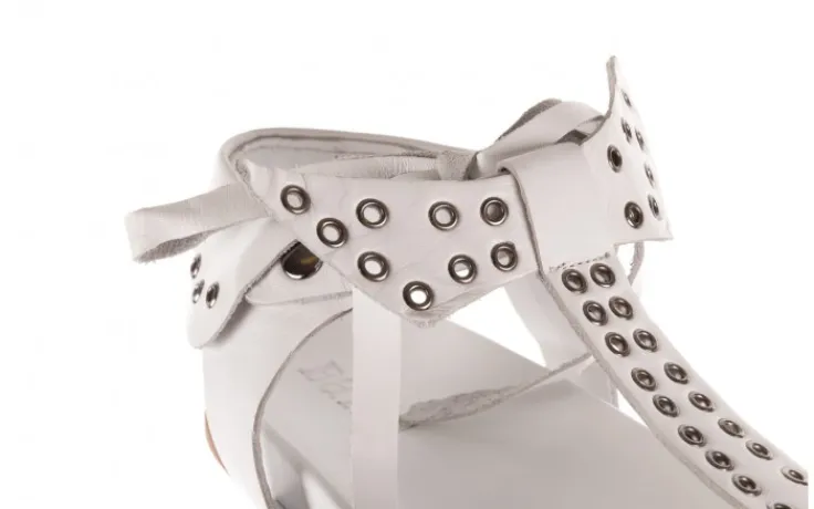Sandałki-japonki marki Bayla wykonane z naturalnej licowej skóry w kolorze białym. Buty z przodu ozdobione kokardą ze skórzanych pasków, ozdobionych metalowymi dziurkami. Zapinane z boku na dwa zatrzaski. Przy kokardzie znajdują się dwa skórzane sznurki, które można zawiązać wokół kostki.