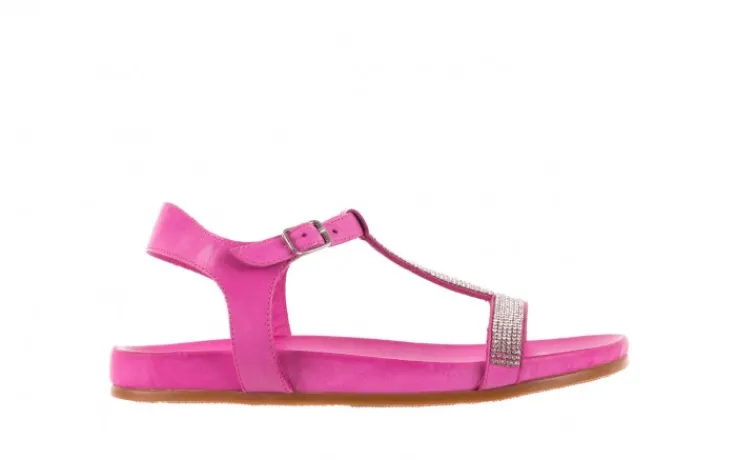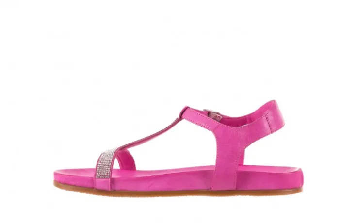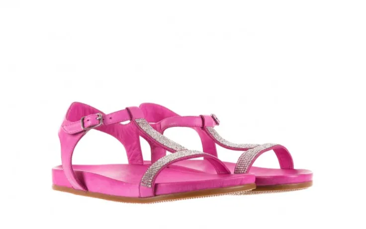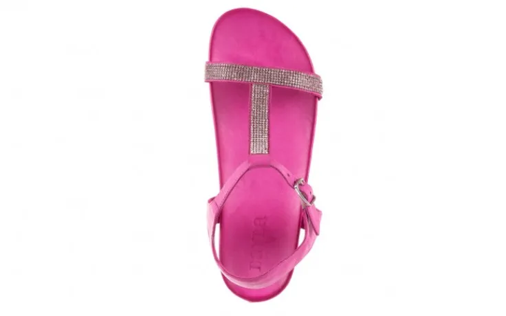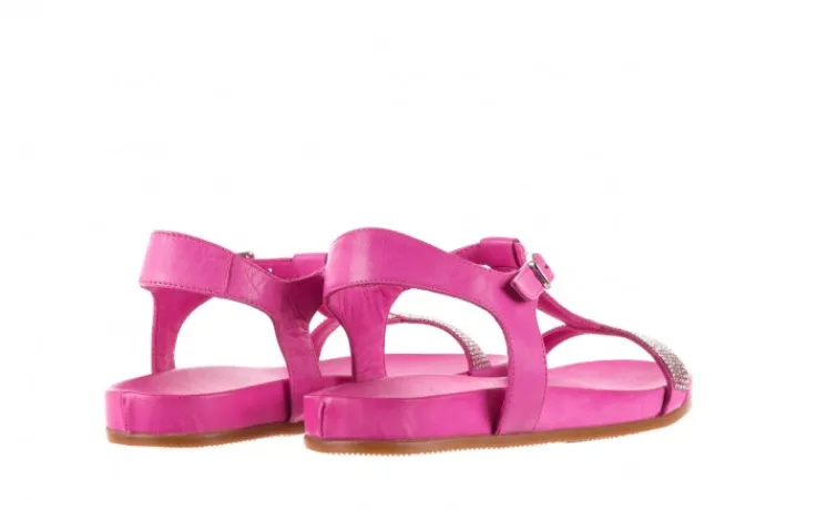 Sandałki marki Bayla wykonane z naturalnej licowej skóry w kolorze różowym. Paseczki z przodu ozdobione małymi kryształkami w kolorze srebrnym.