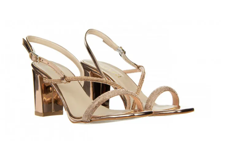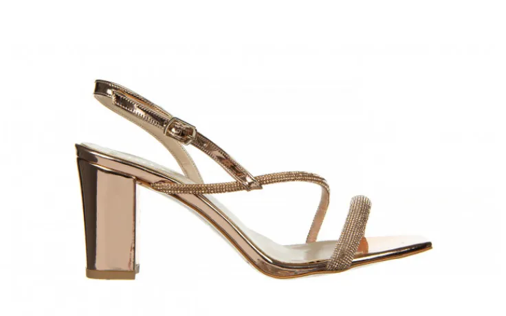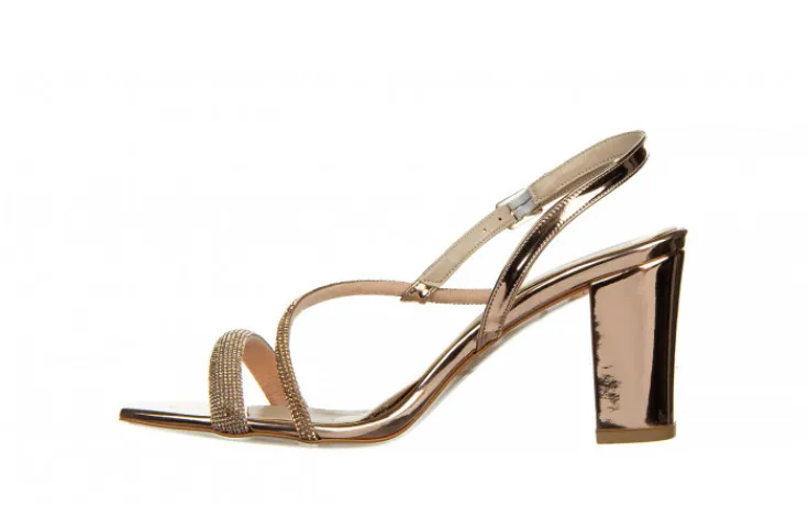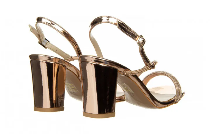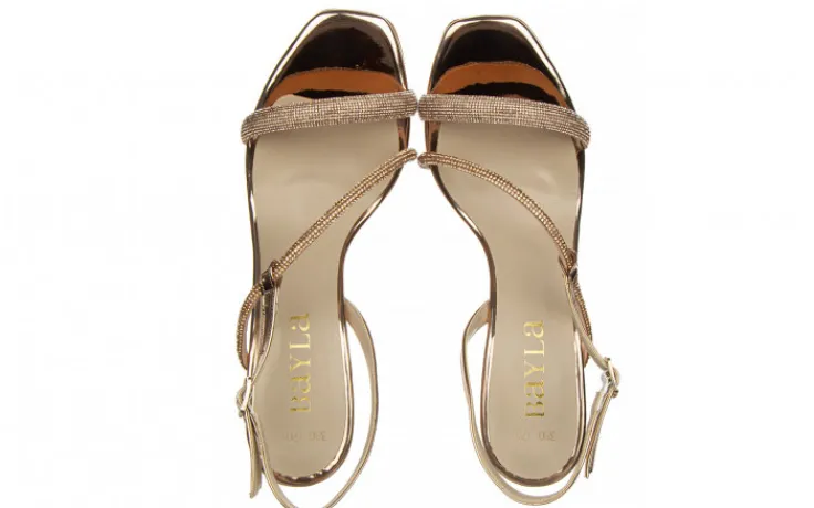 Sandały marki Bayla wykonane ze skóry ekologicznej w kolorze różowego złota, lakierowane.