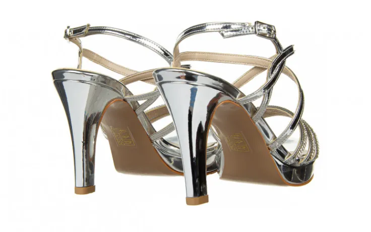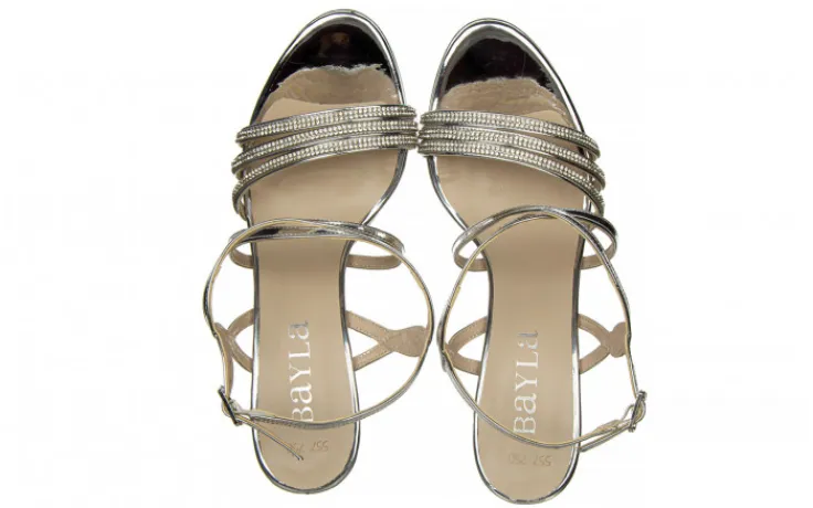 Sandały marki Bayla wykonane ze skóry ekologicznej w kolorze srebrnym, lakierowane.