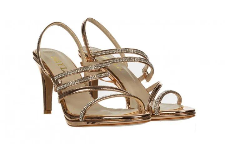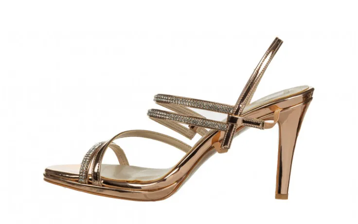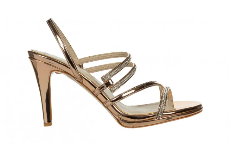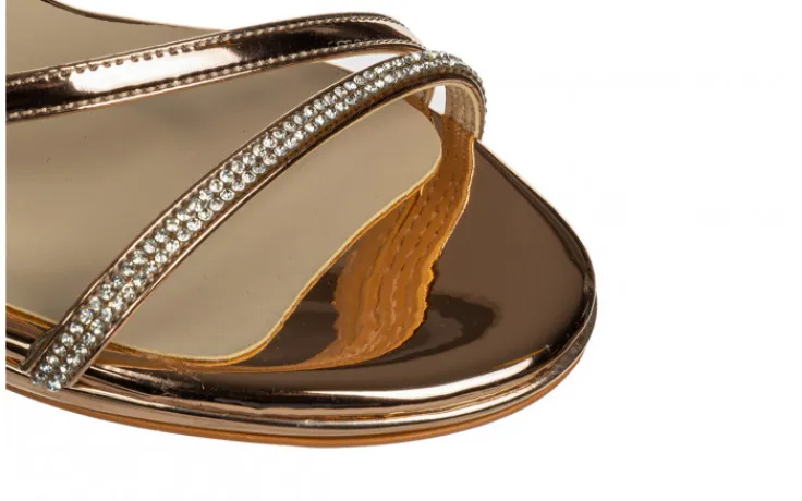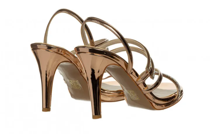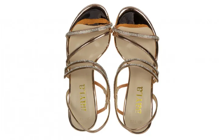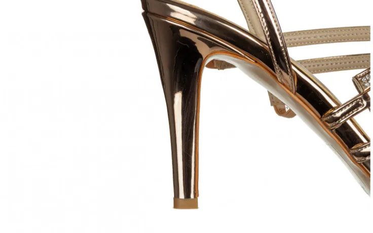 Sandały marki Bayla wykonane ze skóry ekologicznej w kolorze różowego złota, lakierowane.