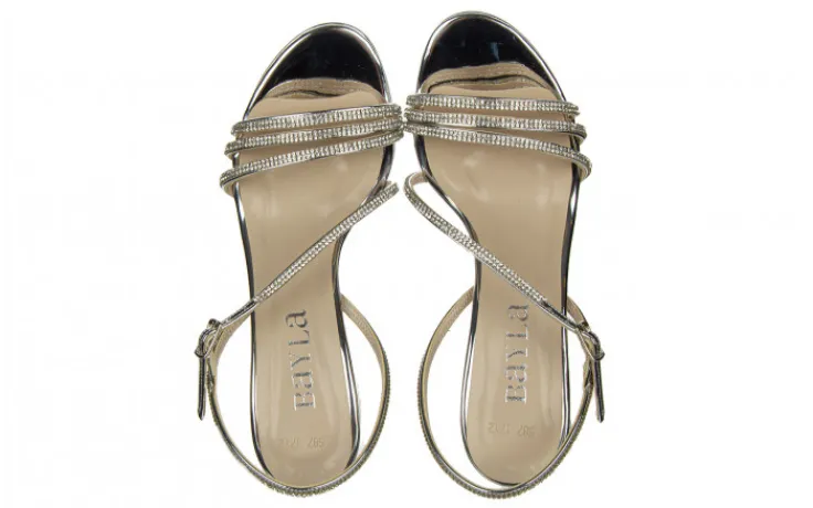 Sandały marki Bayla wykonane ze skóry ekologicznej w kolorze srebrnym, lakierowane.