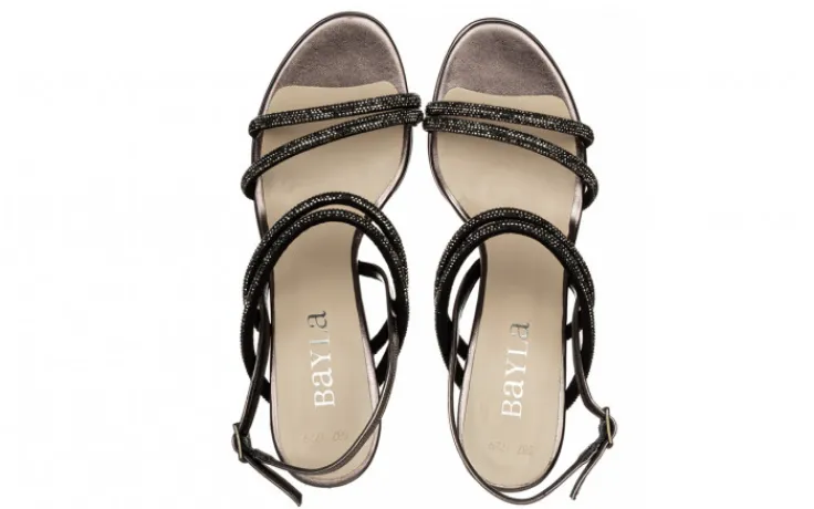 Sandały marki Bayla wykonane ze skóry ekologicznej w kolorze czarnym z platynowym odbiciem, lakierowane.
