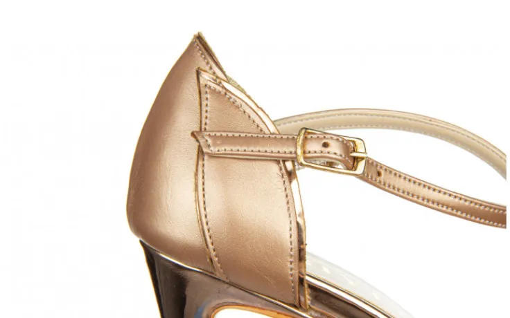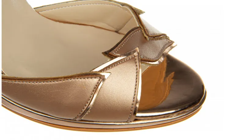 Buty są lekkie, wygodne i pięknie prezentują się na nodze. Sandały mają zakrytą piętę i odkryte palce. Przedni pasek w formie matowych listków z lakierowanym obrysem nadaje im wyjątkowego, kobiecego charakteru i przyciąga wzrok. Kształt paska sprawia, że buty dobrze trzymają stopę, nie powodując odgnieceń. Zapięcie na klamerkę na pasku okalającym kostkę pozwala dopasować buty do szerokości każdej stopy. Platforma niweluje wysokość obcasa sprawiając, że buty są bardzo wygodne i stabilne.