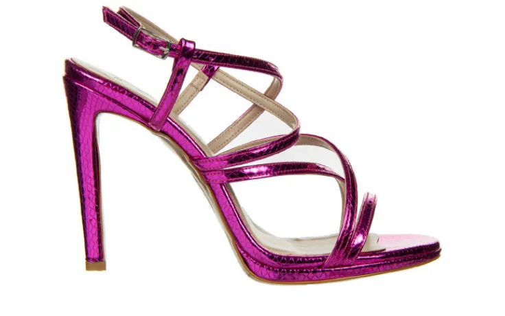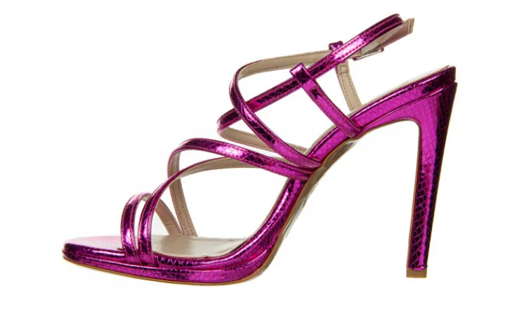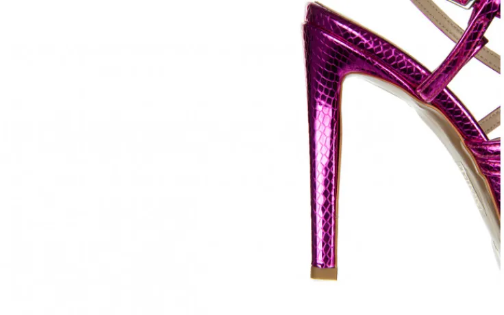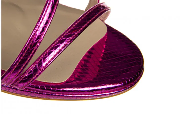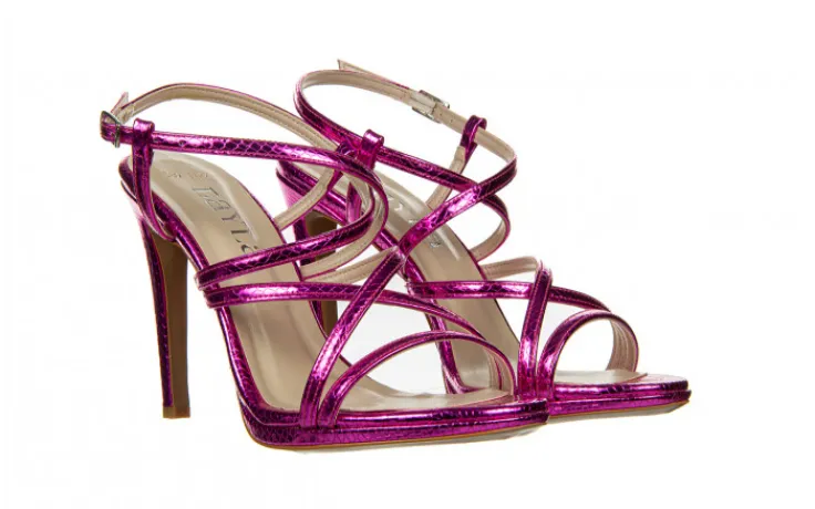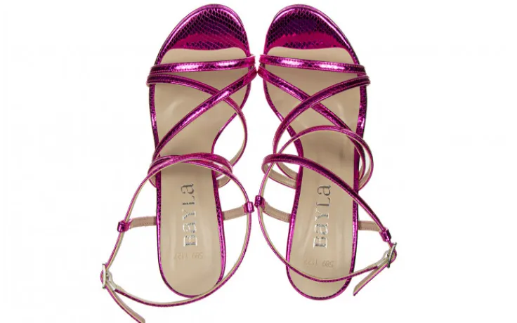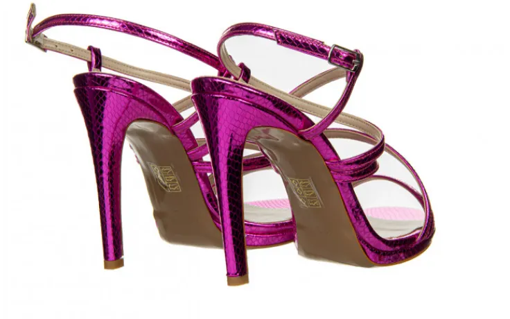 Sandały marki Bayla wykonane ze skóry ekologicznej w kolorze fuksjowym z teksturą skóry węża, lakierowane.