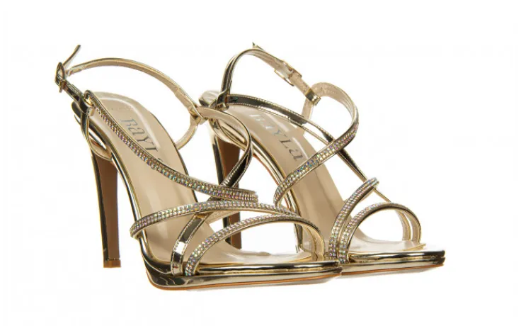 Sandały marki Bayla wykonane ze skóry ekologicznej w kolorze złotym, lakierowane.