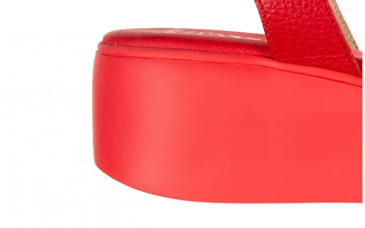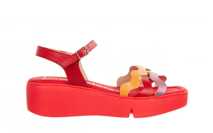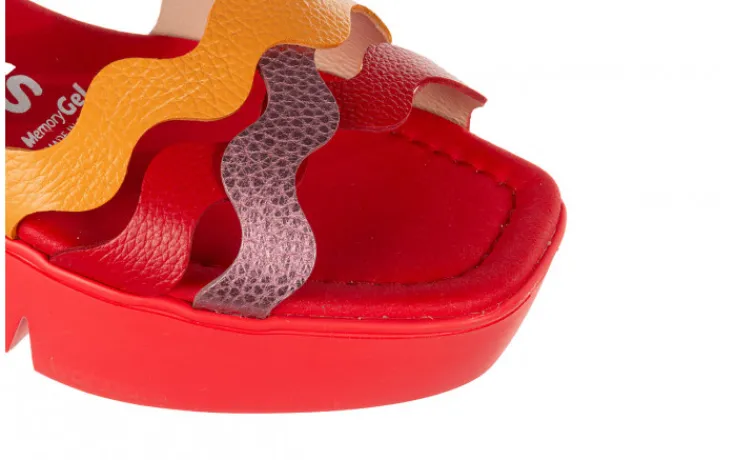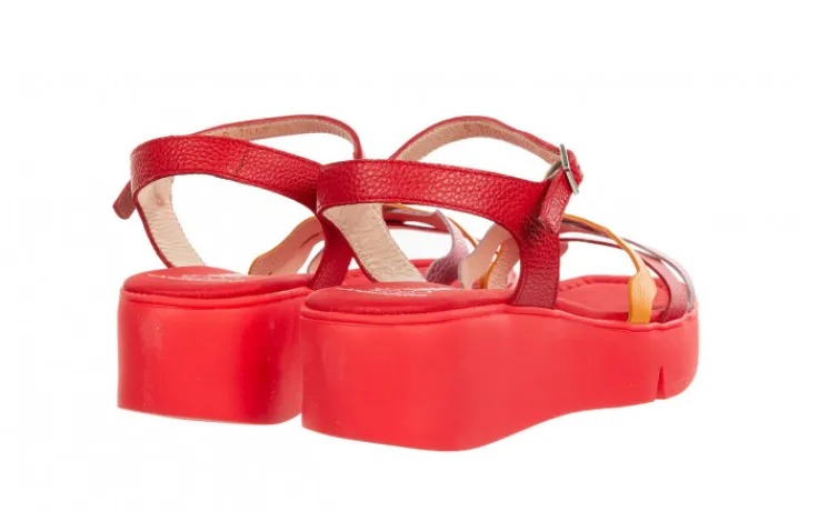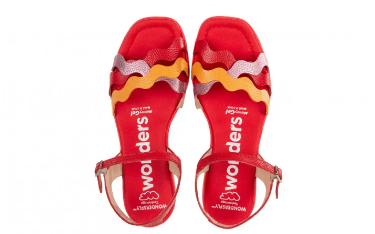 Sandały hiszpańskiej marki Wonders w kolorze czerwonym z żółtym i fioletowym akcentem.