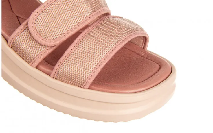 Paski są wykonane z miękkiego, oddychającego materiału tekstylnego. Sandały z trzema paskami: na przodzie dwa, w tym jeden zapinany na rzep oraz drugi zapinany wokół kostki. Podeszwy zrobione z utwardzonego tworzywa syntetycznego wysokiej jakości. Niezwykle miękkie wkładki.