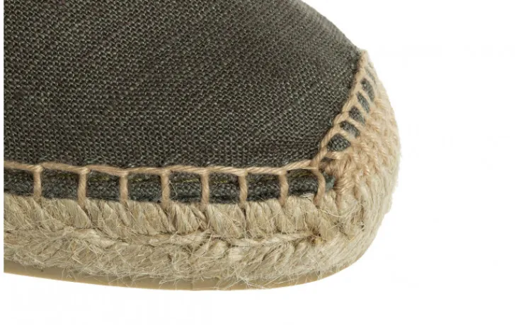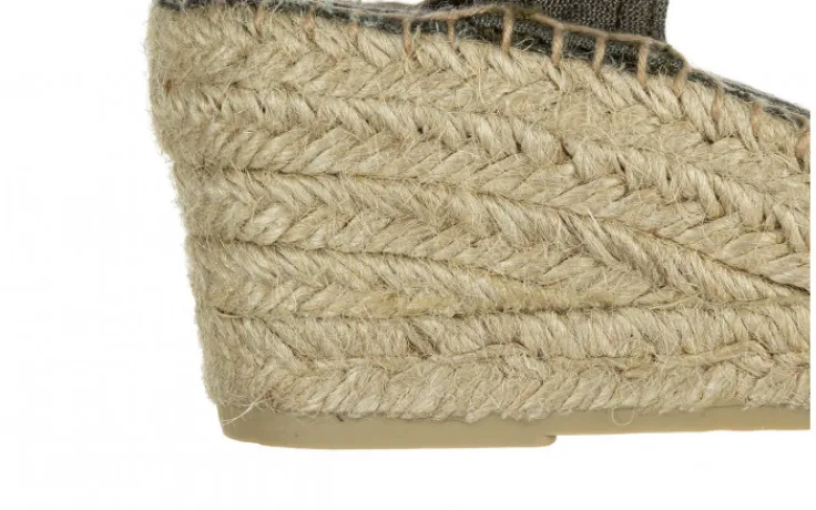 Espadryle z zabudowanym, okrągłym noskiem. Wykonane z oddychającej tekstylnej wyściółki. W górnej części dwie gumki, które odpowiednio podtrzymują stopę. Wkładka wyłożona tkaniną. Podeszwy z antyposlizgowej gumy odpornej na ścieranie doskonale amortyzują stopy na różnego rodzaju podłożu. Skóra i podeszwa są ręcznie zszyte wysokiej jakości nićmi bawełnianymi.