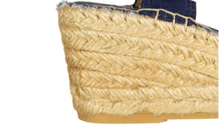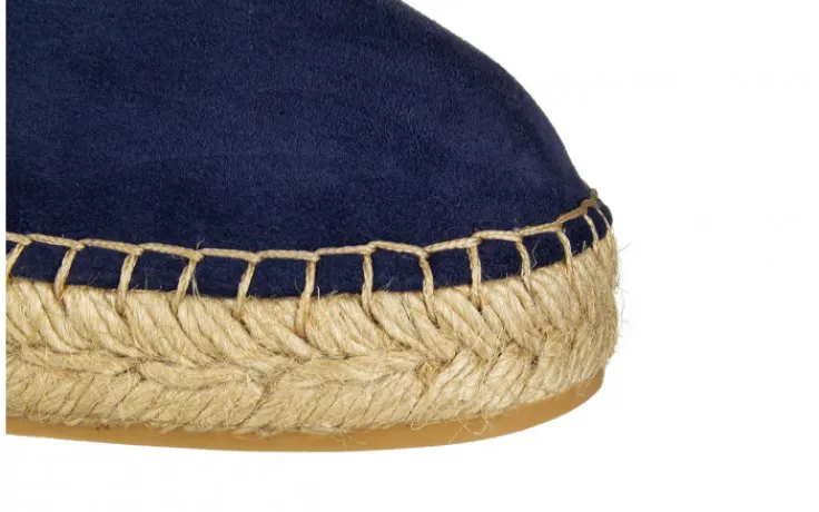 Espadryle z zabudowanym, okrągłym noskiem wykonane z zamszu i i oddychającej tekstylnej wyściółki. Elastyczne paski boczne, które zapewniają doskonałe wsparcie stopy. Wkładka wyłożona tkaniną. Podeszwy z antyposlizgowej gumy odpornej na ścieranie doskonale amortyzują stopy na różnego rodzaju podłożu. Skóra i podeszwa są ręcznie zszyte wysokiej jakości nićmi bawełnianymi.