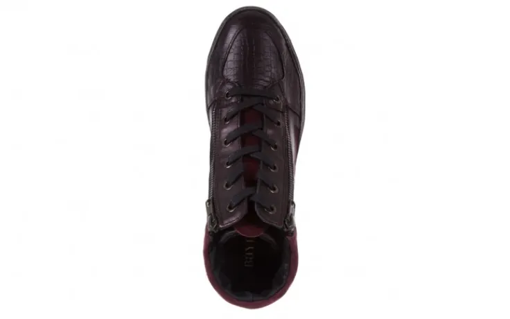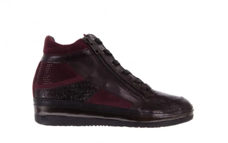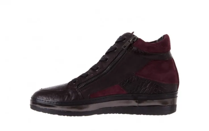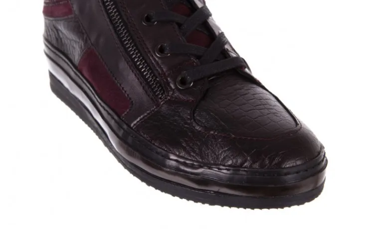 Bordowe sneakersy na koturnie marki Bayla, wykonane ze skóry zamszowej oraz licowej o fakturze imitującej skórę węża. Zamki po obu stronach buta ułatwiają jego zakładanie. Buty dodatkowo są sznurowane z przodu. Ozdobny ciemno-srebrny pasek przy podeszwie. Wkładki oraz wyściółka wykonana ze skóry naturalnej.