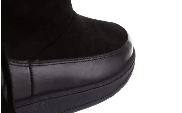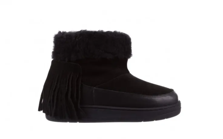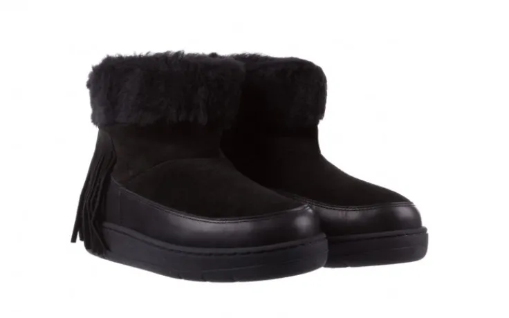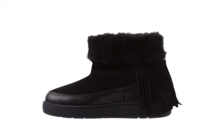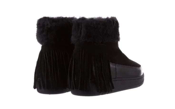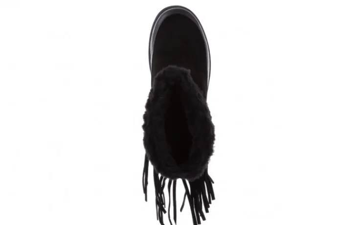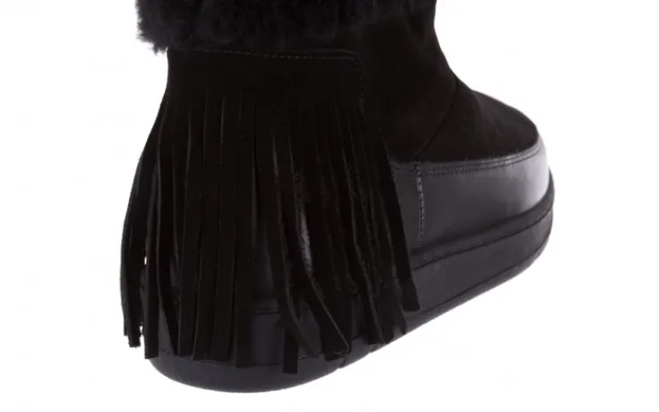 Cholewki ponad kostkę ze skóry zamszowej w klasycznej czerni, u góry ozdobione mięciutkim futerkiem. Oryginalnego charakteru dodają im skórzane frędzelki w stylu BOHO na zapiętkach.