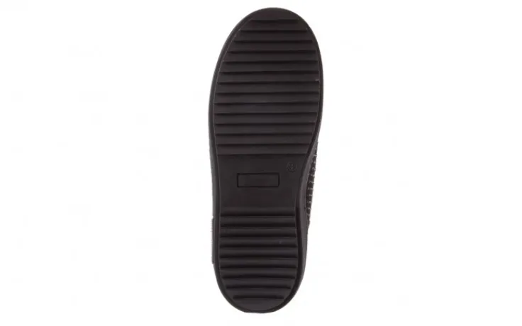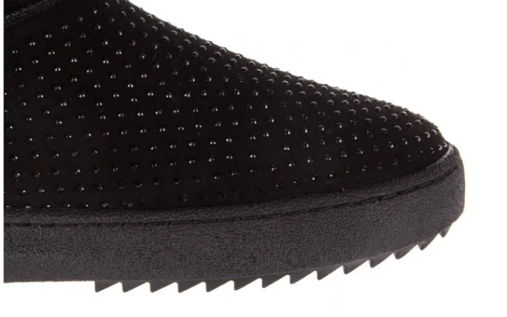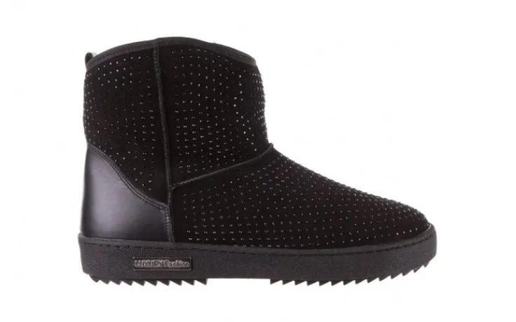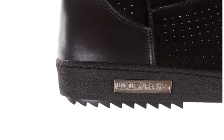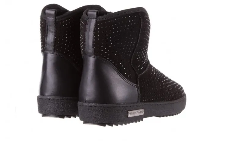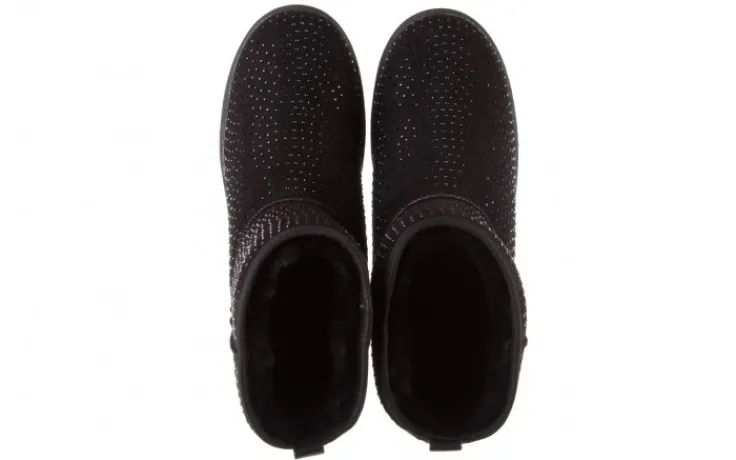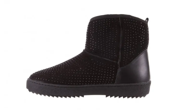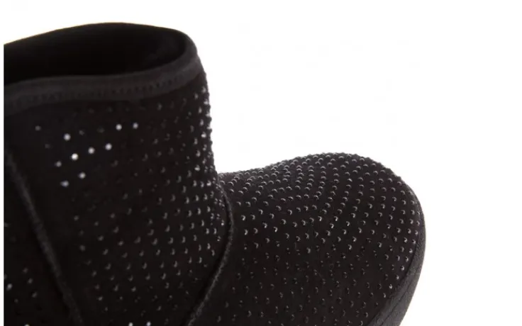 Czarne cholewki wykonane z naturalnego kożucha ozdobionego czarnymi dżetami.Tył butów (nad piętą) posiada wstawkę z czarnej, licowej skóry. Antypoślizgowa, podwyższona podeszwa dla lepszej przyczepności butów. Obuwie wsuwane. Wyciągane wkładki.