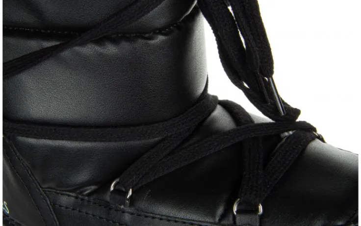 Oryginalne śniegowce z cholewką do połowy łydki wykonane z przyjemnego w dotyku materiału. Buty są łatwe w zakładaniu i bardzo ładnie prezentują się na nodzę. Cholewka przyozdobiona efektownym, regulowanym sznurowaniem oraz kontrastującymi napisami. Botki mają usztywniony zapiętek. Wkładka oraz wyściółka wykonana z grubszego ocieplenia (wyciąganego). Antypoślizgowa, gumowa podeszwa zwiększa przyczepność oraz izoluje od zimnego podłoża.