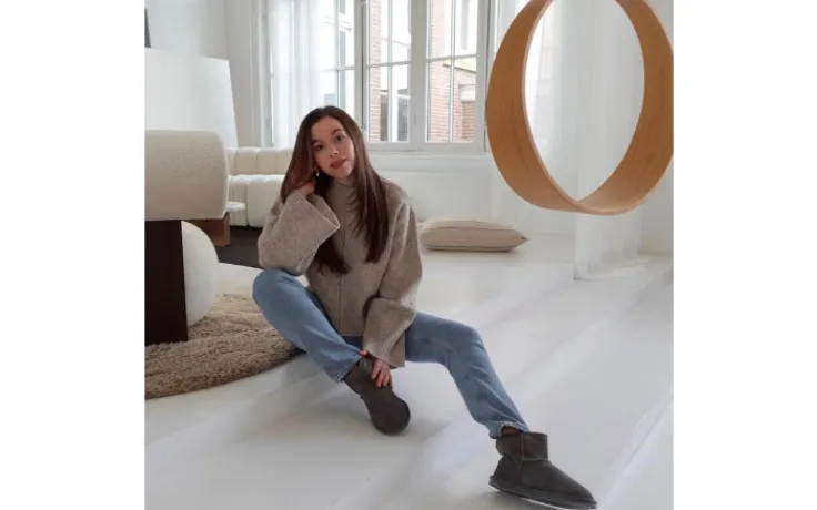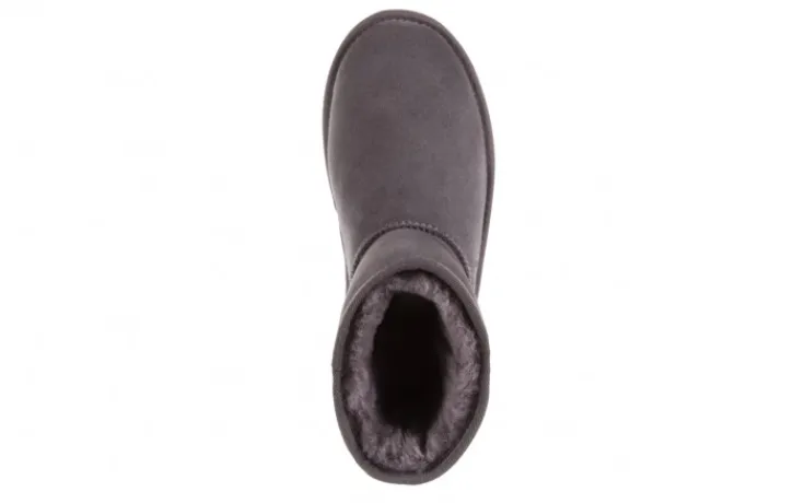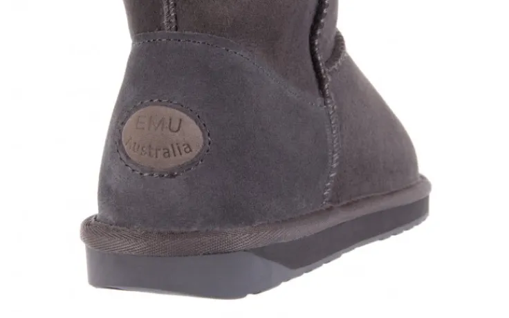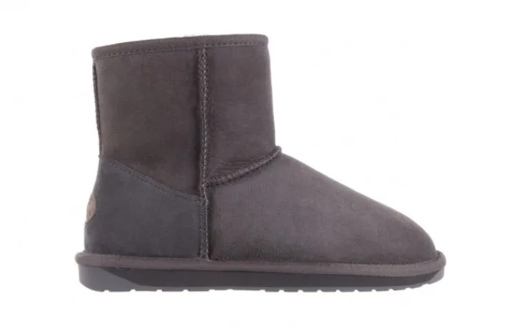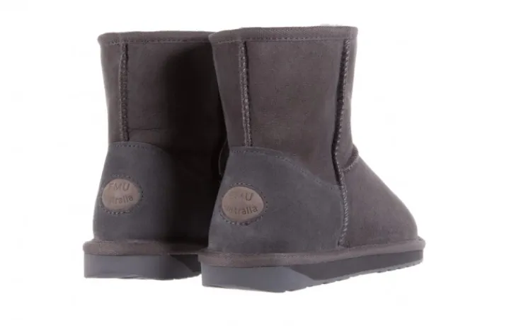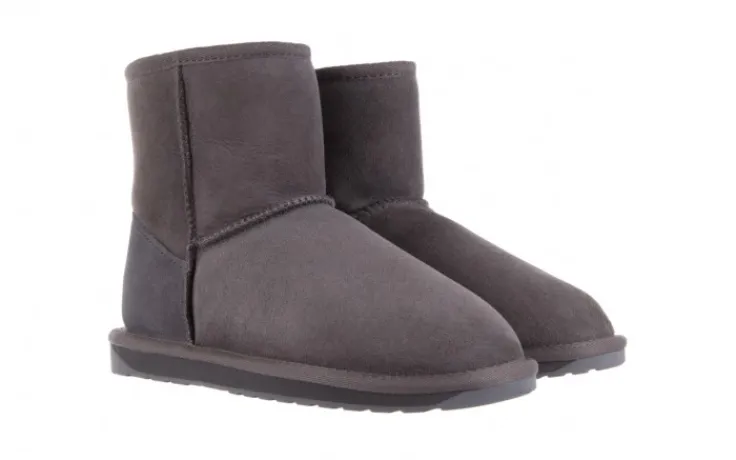 Śniegowce australijskiej marki EMU. Cholewki ponad kostkę w kolorze szarym wykonane z kożucha australijskich merynosów. Zastosowana technologia polega na zaimpregnowaniu skóry już na etapie produkcji. Dzięki temu modele Stinger łatwiej jest utrzymać w czystości [buty dłużej wyglądają jak nowe]. Kożuch z jednej strony zapewnia ciepło, a z drugiej przepuszcza powietrze i zapobiega poceniu się stóp.