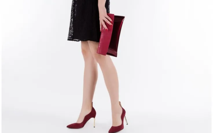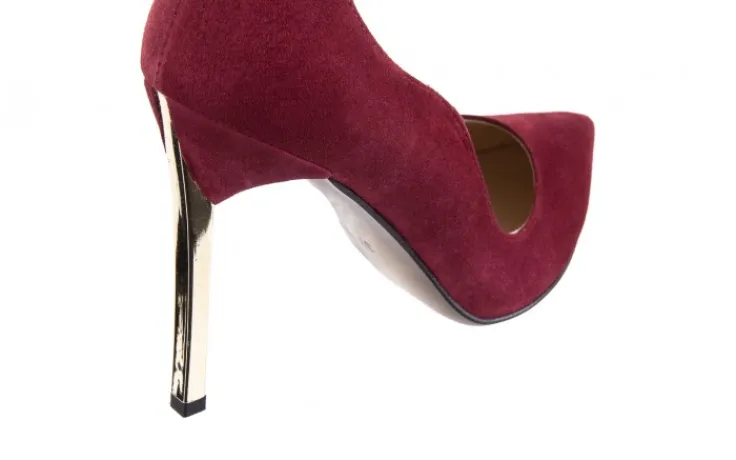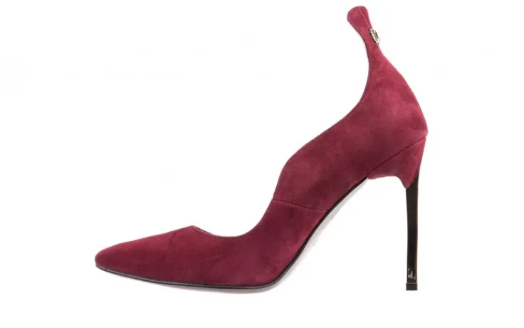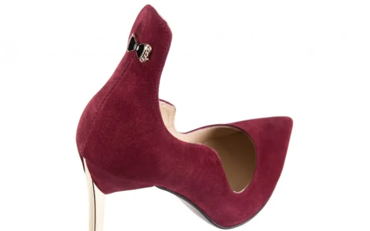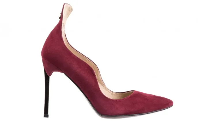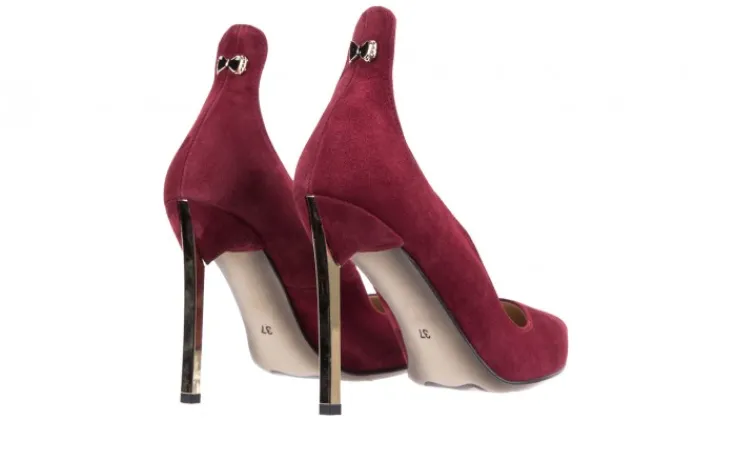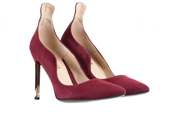 Asymetryczne szpilki marki Bayla w szlachetnym, odcieniu winnej czerwieni pokryte są skórą nubukową. Wkładka i wyściółka wykonana jest w całości ze skóry naturalnej, co znacznie podwyższa komfort użytkowania butów. Mimo stosunkowo wysokich, dziesięciocentymetrowych obcasów czółenka są stabilne. Głęboko wycięta, asymetryczna cholewka i złote obcasy o metalicznym połysku sprawiają, że to szpilki które idealnie wpasowują się w najnowsze trendy.