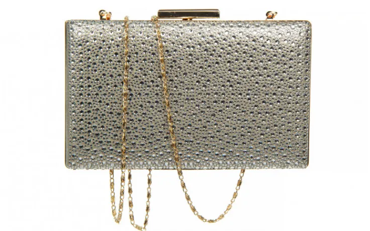Torebka zapinana na zatrzask. Przód torebki w całości ozdobiony pięknie błyszczącymi cyrkoniami. Tylna część torebki wykonana ze skóry ekologicznej ze złotym lustrzanym odbiciem. Wnętrze torebki wykonane z miękkiego w dotyku materiału typu welur. Torebka posiada długi łańcuszek na ramię (odpinany) w kolorze złotym. Nie mieści formatu A4. Środek nie zawiera dodatkowych kieszonek.