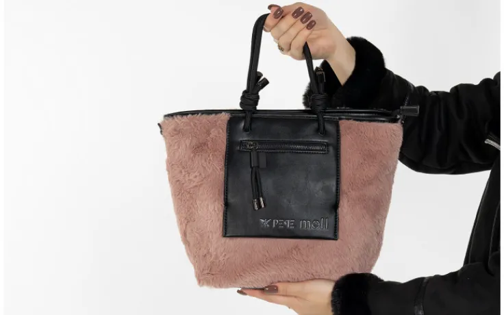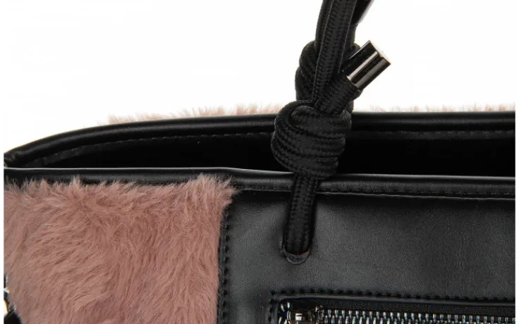 Torebka wykonana z połączenia wysokogatunkowego sztucznego futerka i skóry ekologicznej. Model posiada dwie solidne rączki w formie efektownie zawiązanych sznurków, dodatkowo jeden długi, dopinany, regulowany pasek z materiału ze wstawkami ze skóry ekologicznej. Pojemne wnętrze torebki obite zostało materiałem w kolorze niebieskim. Nie mieści formatu A4. W głównej komorze dwie kieszonki, w tym jedna na zasuwak.